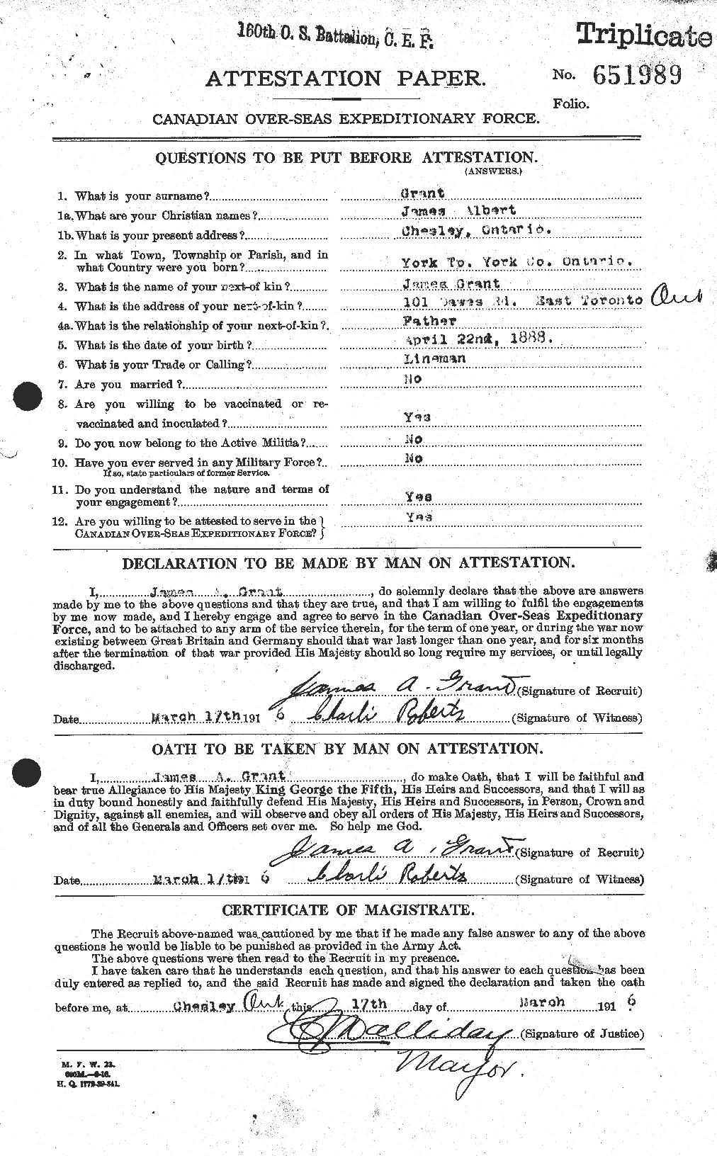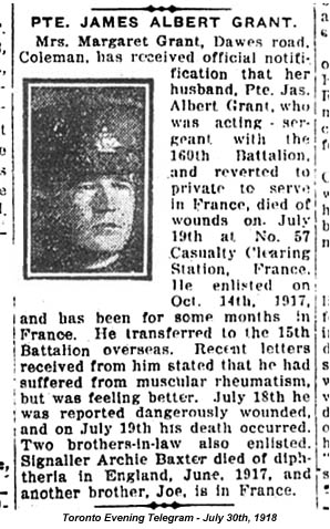 Mrs. Margaret Grant, Dawes road Coleman, has received official notification that her husband, Pte. Jas. Albert Grant, who was an acting sergeant with the 160th Battalion, and reverted to private to serve in France, died of wounds on July 19th at the not 57 Casualty Clearing Station, France. He enlisted on October 14, 1917, and has been for some months in France. He transferred to the 15th [sic] Battalion overseas. Recent letters received from him stated that he had suffered from muscular rheumatism, but was feeling better. July 18th he was reported dangerously wounded, and on July 19th his death occurred. Two brothers-in-law also enlisted, Signaller Archie Baxter died of diphtheria in England, June, 1917, and another brother, Joe, is in France.