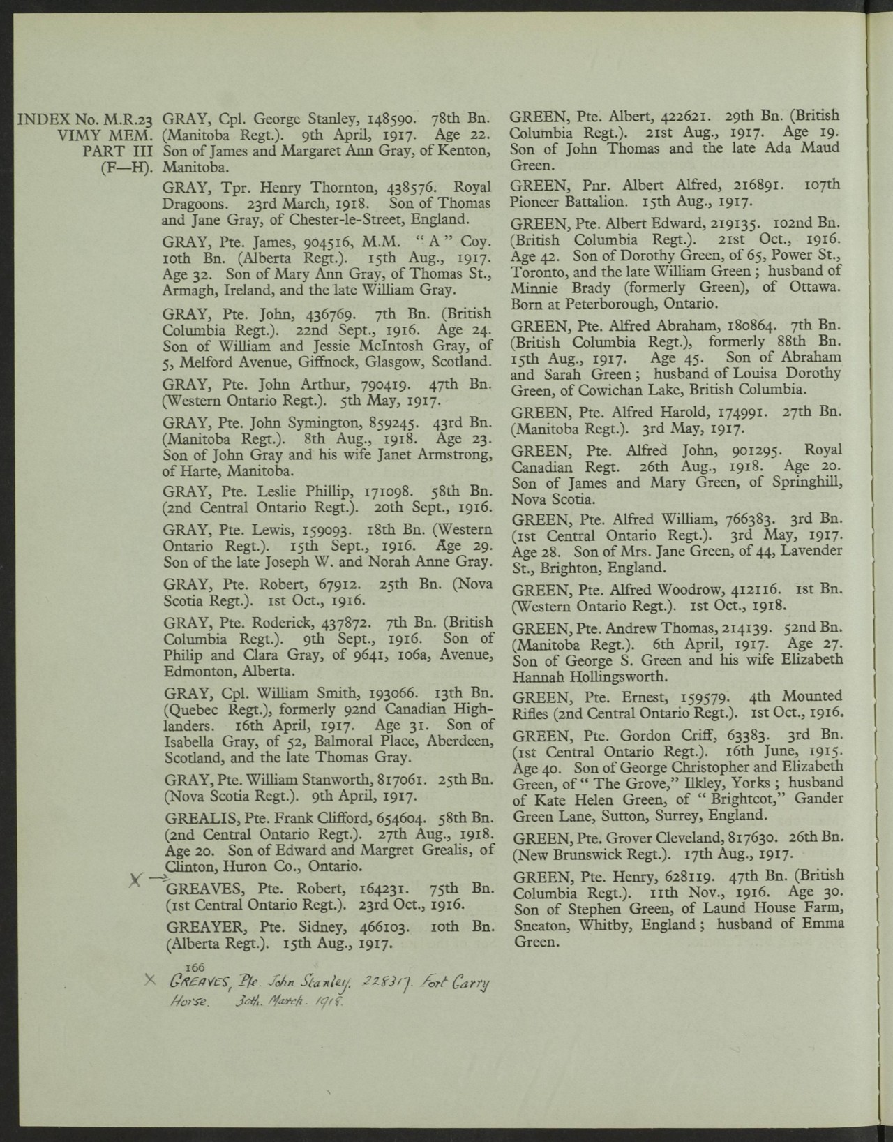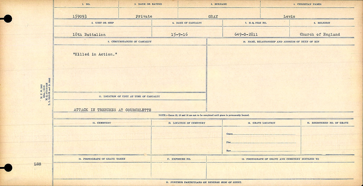 Family Search: Private Lewis Gray was born on 1 January 1891, in Halifax, West Yorkshire, England, United Kingdom as the son of Joseph W. Gray and Norah Anne. He immigrated to Syracuse, Onondaga, New York, United States in 1913 and lived in Halifax St James, Halifax, Yorkshire, England, United Kingdom in 1901. He registered for military service in 1915. In 1915, at the age of 24, his occupation is listed as labourer. He died on 15 September 1916, in Courcelette, Somme, Picardie, France, at the age of 25, and was buried in Vimy, Pas-de-Calais, Nord-Pas-de-Calais, France.