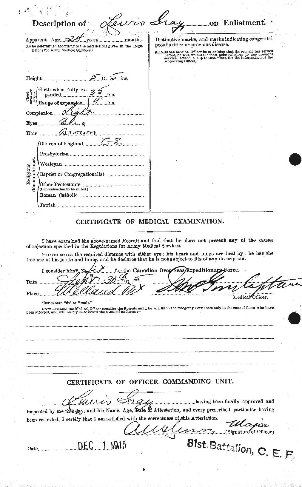 This member of the 44th Regiment, Canadian Militia, with prior service with a British regiment, enlisted with 81st Battalion on September 30, 1915, at Welland, Ontario.