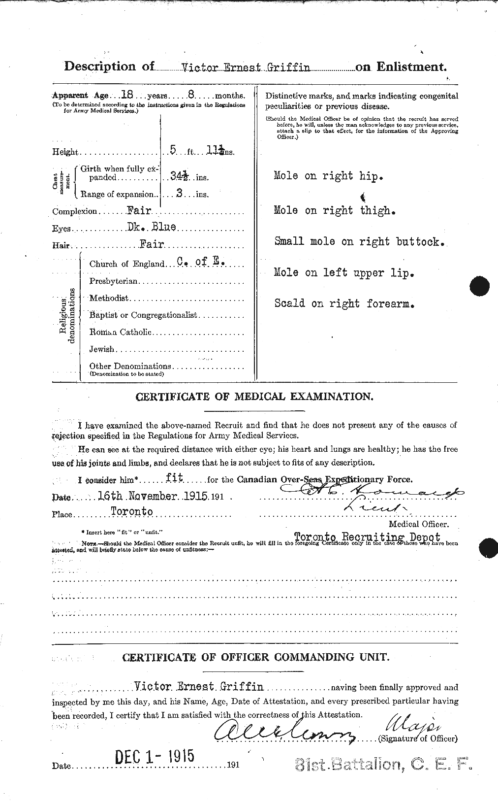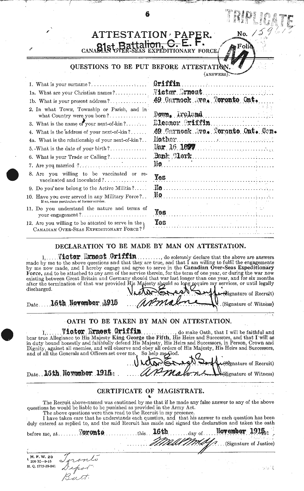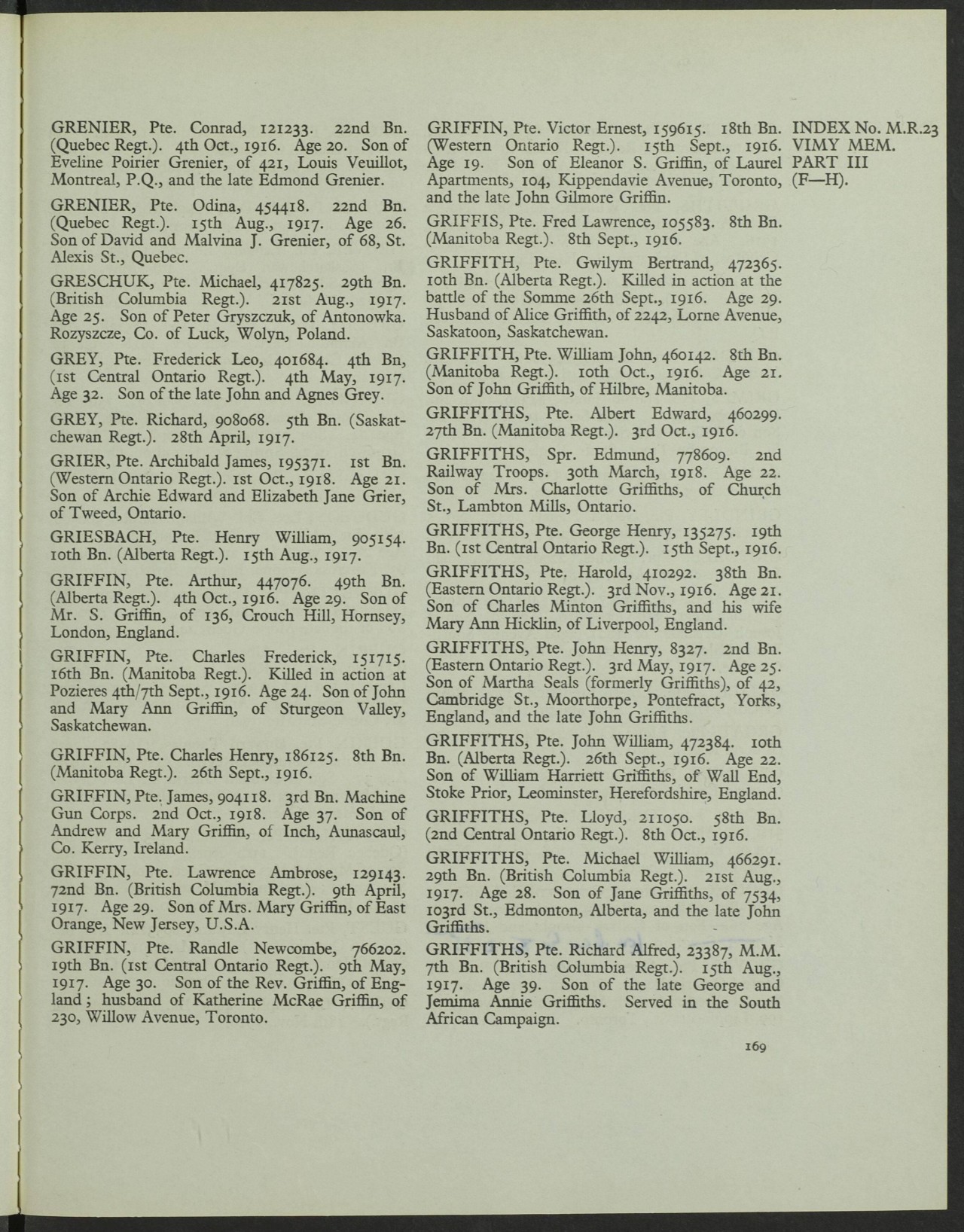 Pte. Victor E. Griffin of Toronto Makes Supreme SacrificePTE. VICTOR E. GRIFFIN, fifth son of Mrs. Griffin, 49 Garnock ave., has been killed in action in his 19th year. He went overseas with the 81st Battalion, but was drafted about two months ago to an Ontario Battalion of the 2nd Division, with which he served while near Yyres [Ypres], later moving down to the Somme district. With them he took part in the storming of Courcelette.