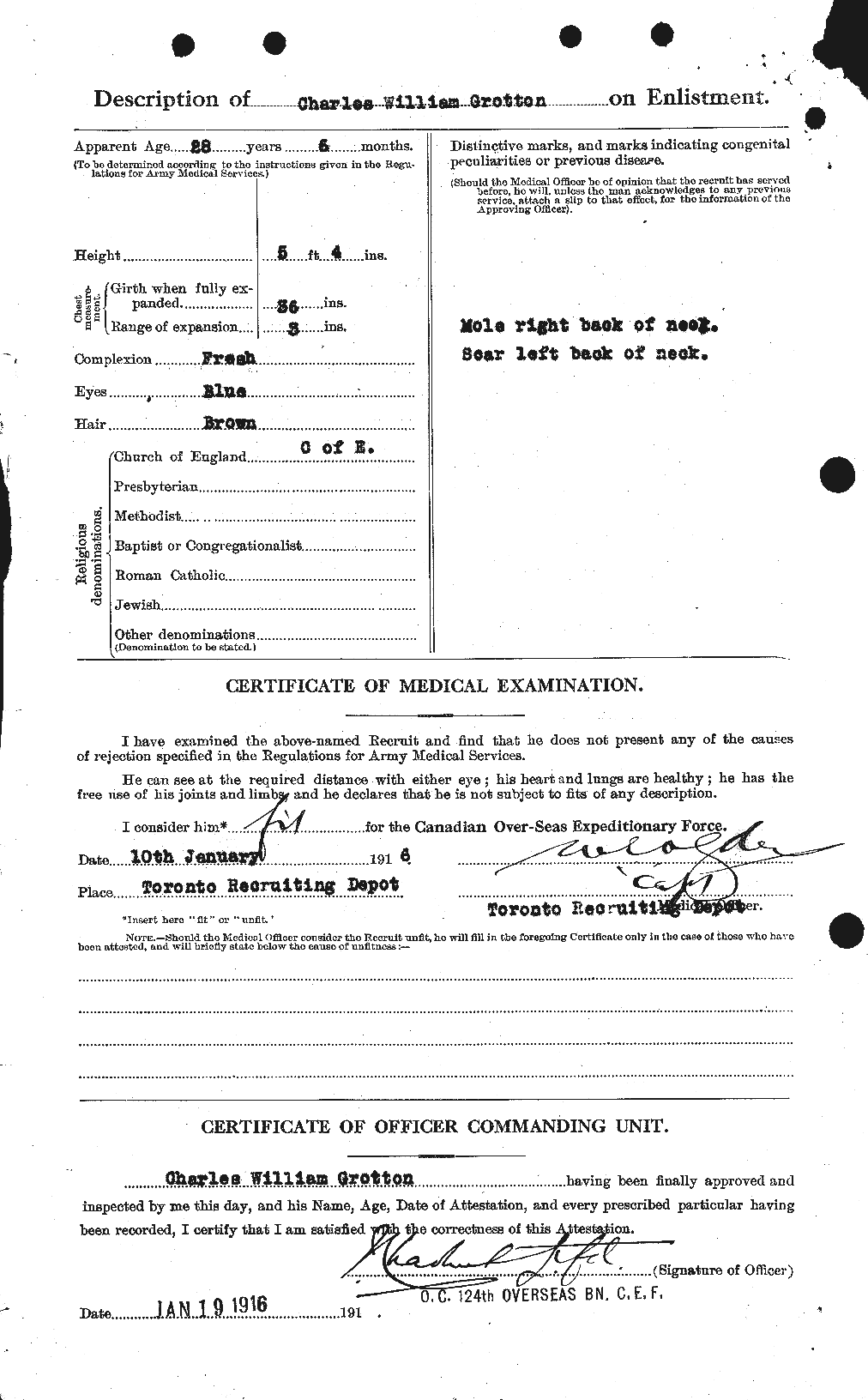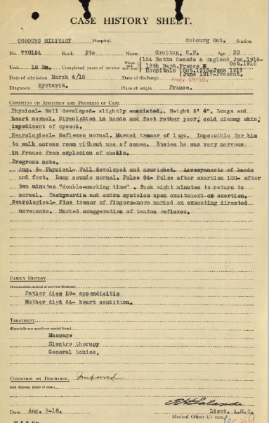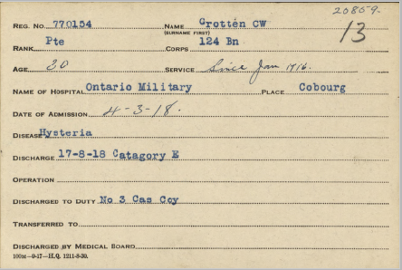 Grotten, Charles William: Service no. 770154 CVWM Page Digitized Service Record Source: C.E.F. message board post. Find-A-Grave Grave marker at Prospect Cemetery, Toronto, Ontario. It incorrectly indicates he was a member of the 8th Battalion. He was a member of the 18th. Source CVWM Share this: Click to email a link to a friend (Opens in new window) Email Click to share on Facebook (Opens in new window) Facebook Click to share on X (Opens in new window) X Click to share on Reddit (Opens in new window) Reddit Click to share on LinkedIn (Opens in new window) LinkedIn Click to print (Opens in new window) Print Click to share on Tumblr (Opens in new window) Tumblr Click to share on Pocket (Opens in new window) Pocket Click to share on Pinterest (Opens in new window) Pinterest Click to share on Telegram (Opens in new window) Telegram Click to share on WhatsApp (Opens in new window) WhatsApp Like Loading...
