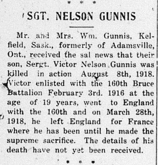 Gunnis, Victor Nelson: Service no. 651630 CVWM Page Digitized Service Record Source: Web search Find-A-Grave Gunnis, Victor Nelson: Service no. 651630. Via the 160th Bruce Battalion Facebook Group. Source: Albemarle Township Historical Society Canadian Echo, August 28, 1918, p.1. “Killed in Action” During an attack on Marcelcave, he was hit by machine gun fire and instantly killed. Share this: Click to email a link to a friend (Opens in new window) Email Click to share on Facebook (Opens in new window) Facebook Click to share on X (Opens in new window) X Click to share on Reddit (Opens in new window) Reddit Click to share on LinkedIn (Opens in new window) LinkedIn Click to print (Opens in new window) Print Click to share on Tumblr (Opens in new window) Tumblr Click to share on Pocket (Opens in new window) Pocket Click to share on Pinterest (Opens in new window) Pinterest Click to share on Telegram (Opens in new window) Telegram Click to share on WhatsApp (Opens in new window) WhatsApp Like Loading...