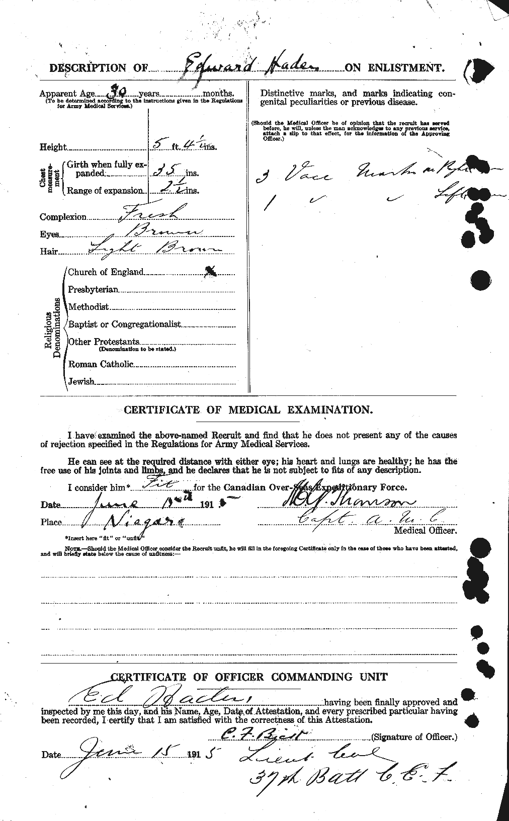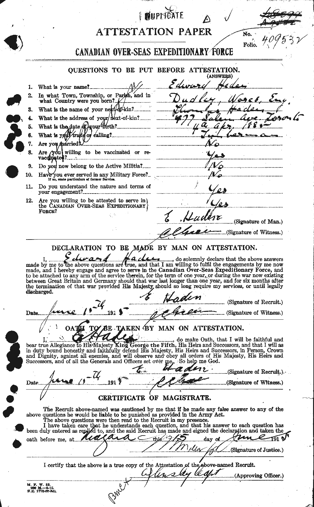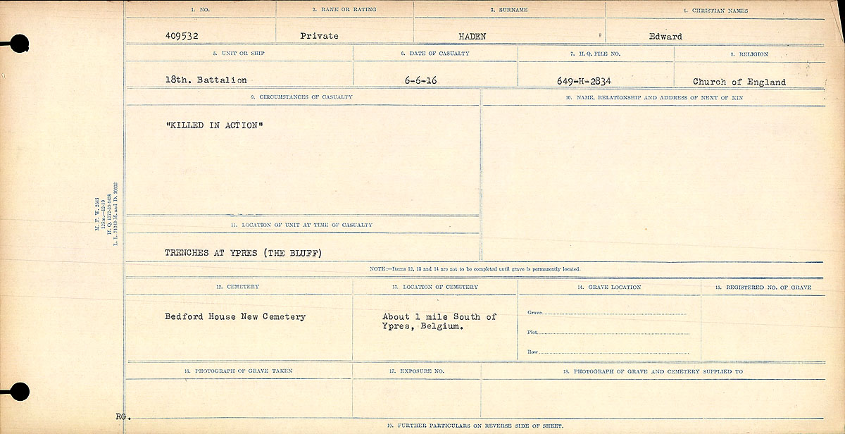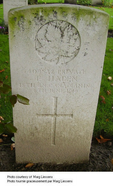 Family Search: Private Edward Haden was born on 4 April 1885, in Dudley, Worcestershire, England, United Kingdom as the son of William Haden and Emma Stevens. He immigrated to Canada in 1912. He registered for military service in 1915. In 1915, at the age of 30, his occupation is listed as lumberman. He died on 6 June 1916, in Ieper, West Flanders, Belgium, at the age of 31, and was buried in Zillebeke, Ieper, West Flanders,