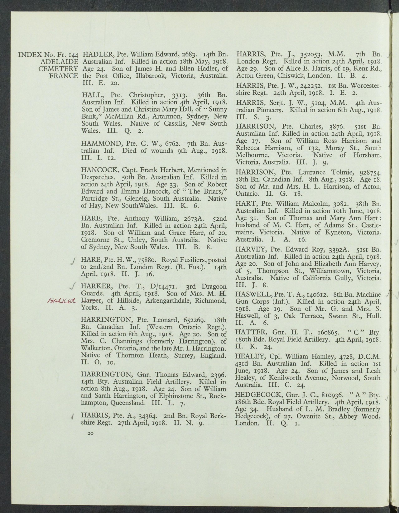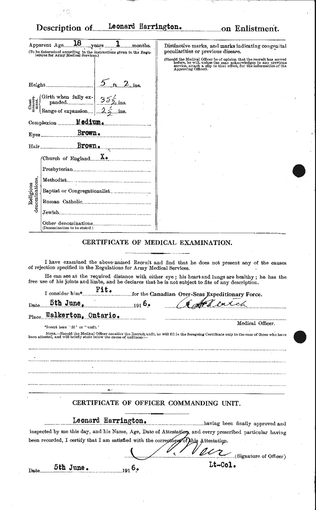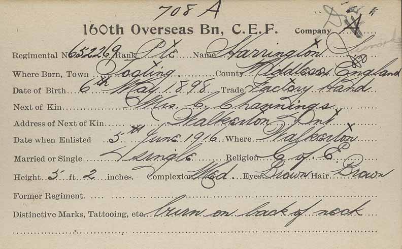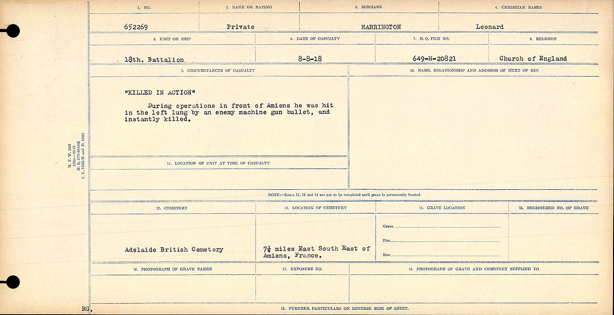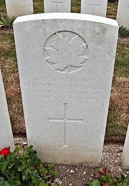Family Search: When Private Leonard Harrington was born on 6 May 1898, in England, United Kingdom, his father, Isaac John HARRINGTON, was 38 and his mother, Caroline JEFFERY, was 34. He immigrated to Canada in 1913 and lived in Croydon, Surrey, England, United Kingdom in 1901 and Purley, Surrey, England, United Kingdom in 1911. He registered for military service in 1916. In 1916, at the age of 18, his occupation is listed as factory hand, canada spool & bobbin co. in Walkerton, Bruce, Ontario, Canada. He died on 8 August 1918, in Amiens, Somme, Picardie, France, at the age of 20, and was buried in Adelaide Cemetery, Villers-Bretonneux, Somme, Picardie, France.