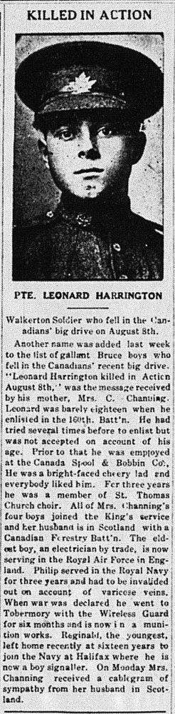 Another name was added last week to the list of gallant Bruce boys who fell in the Canadians’ recent big drive. “Leonard Harrington killed in Action August 8th,” was the message received by his mother, Mrs. C. Channing. Leonard was barely eighteen when he enlisted in the 160th. Batt’n. He had tried several times before to enlist but was not accepted on account of his age. Prior to that he was employed at the Canada Spool & Bobbin Co.. He was a bright-faced cheery lad and everybody liked him. For three years he was a member of the St. Thomas Church choir. All of Mrs. Channing’s four boys joined the King’s service and her husband is in Scotland with a Canadian Forestry batt’n. The eldest boy, an electrician by trade, is now serving with the Royal Air Force in England. Philip served in the Royal Navy for three years and was invalided out on account of varicose veins. When war was declared he went to Tobermory with the Wireless Guard for six months and is now in munition works. Reginald, the youngest, left home recently at sixteen years to join the Navy at Halifax where is is now a boy signaller. On Monday Mrs. Channing received a cablegram of sympathy from her husband in Scotland.