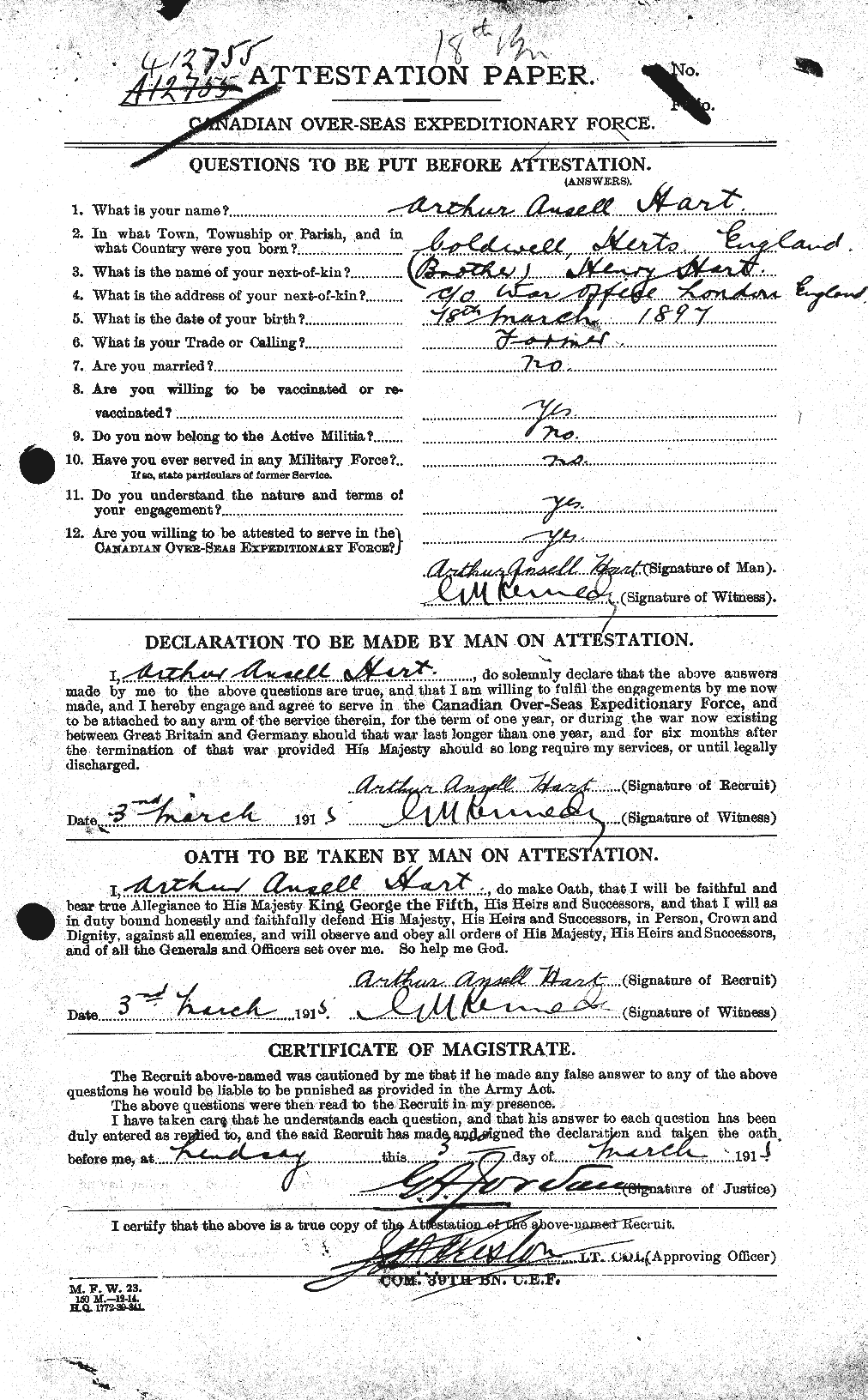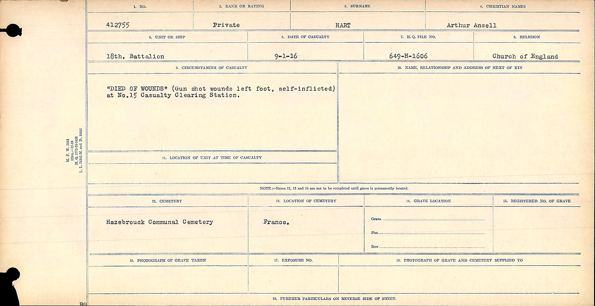 British Home Child. Self-inflicted wounds were accidental. No accident report in service file.