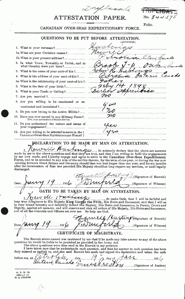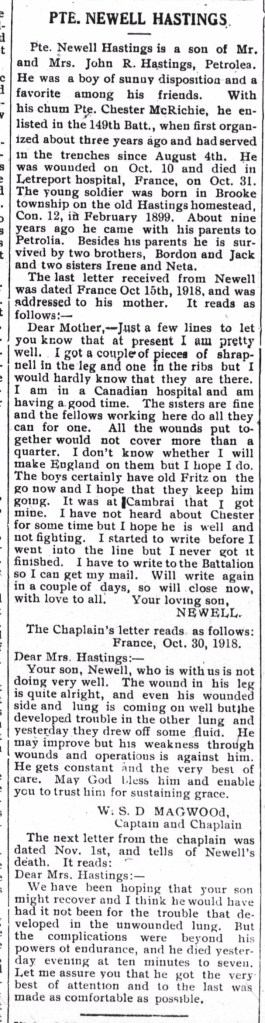 Family Search: When Private Ernest Newell Hastings was born on 14 February 1899, in Brooke, Lambton, Canada West, British Colonial America, his father, John Robert Hastings, was 27 and his mother, Leila V Spalding, was 23. He lived in Lambton, Ontario, Canada in 1911 and Petrolia, Lambton, Ontario, Canada in 1916. He registered for military service in 1916. In 1916, at the age of 17, his occupation is listed as barber’s apprentice in Petrolia, Lambton, Ontario, Canada. He died on 31 October 1918, in Étaples, Pas-de-Calais, Nord-Pas-de-Calais, France, at the age of 19, and was buried in Étaples, Pas-de-Calais, Nord-Pas-de-Calais, France.