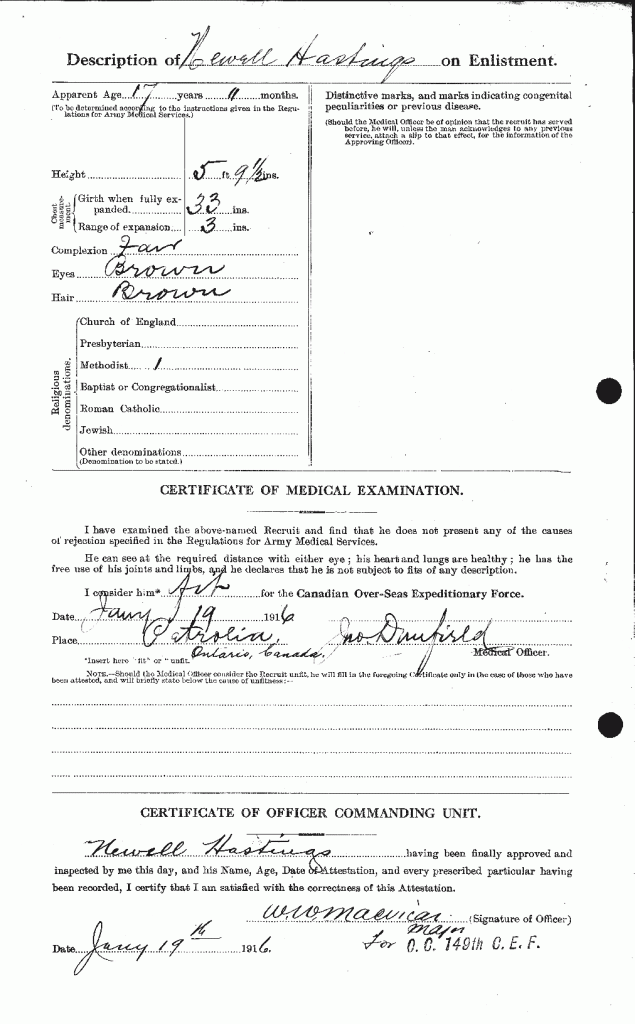 Joining the 149th Battalion at Petrolia, Ontario on January 2, 1916, this 17-year-old barber’s apprentice was off to war.