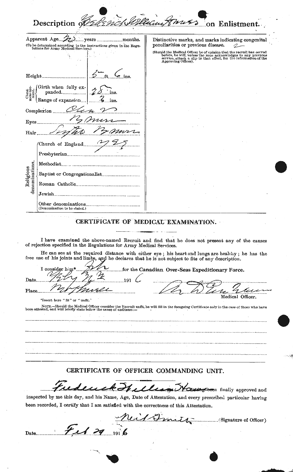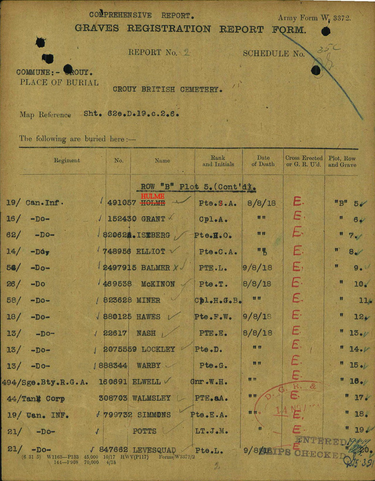 Family Search: When Private Frederick William Hawes was born on 2 May 1896, in Christ Church Spitalfields, London, England, United Kingdom, his father, Percy Walter Hawes, was 31 and his mother, Sarah Taylor, was 35. He immigrated to Quebec City, Quebec, Canada in 1910. He registered for military service in 1916. In 1916, at the age of 20, his occupation is listed as farmer in Bothwell, Kent, Ontario, Canada. He died on 9 August 1918, in Marcelcave, Somme, France, at the age of 22, and was buried in Crouy, Somme, France.