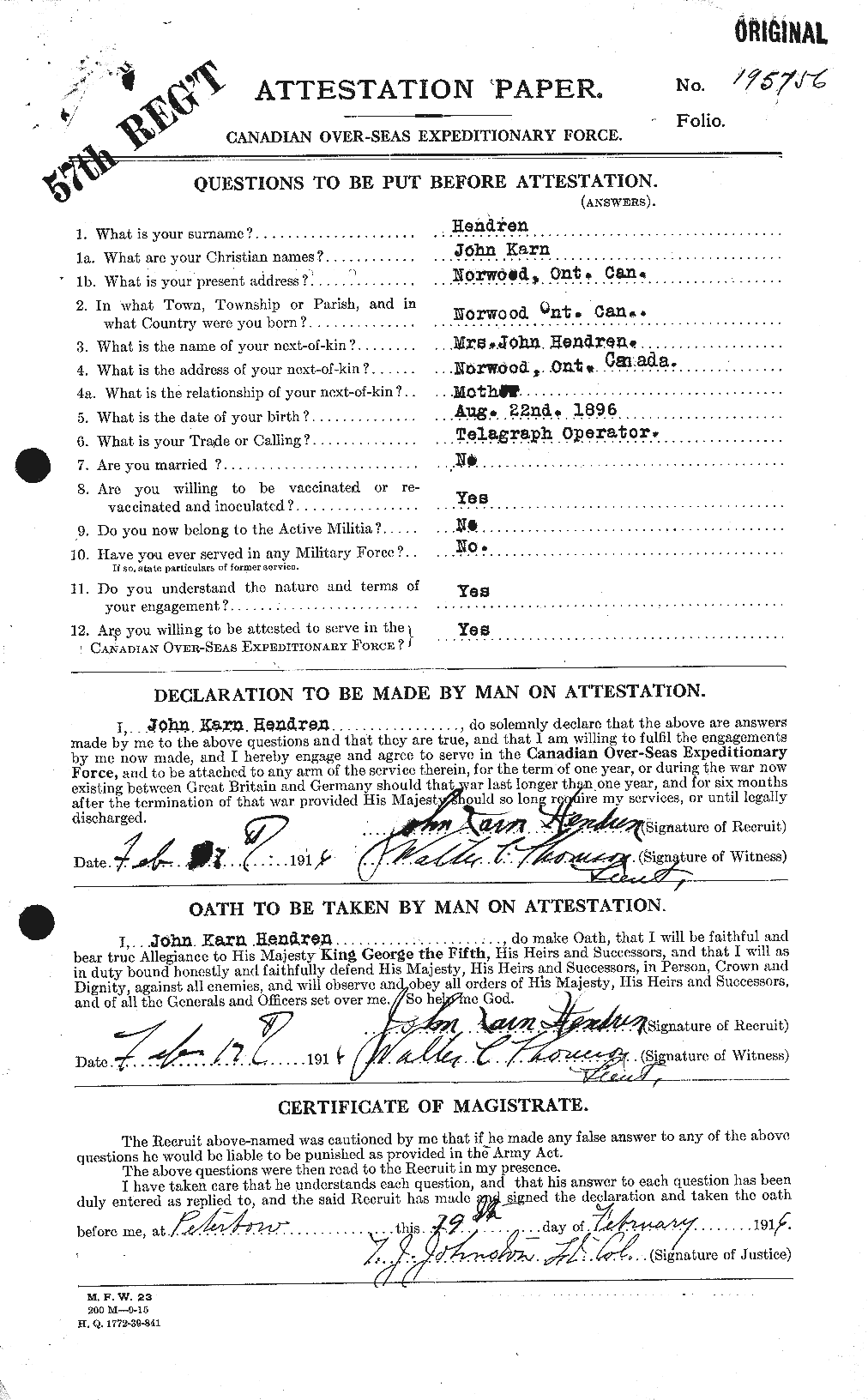 Hendren, John Karn: Service no. 195756 CVWM Page CWGC Page Digitized Service Record Source: April 1918 casualty. Find-A-GRave Picture of John Karn Hendren – Only son of Elizabeth Malcolm Ruttan & John Hendren. Source: CVWM Grave Marker – Grave site of Private John Karn Hendren, visited in 1986 by his great-grandniece, Lisa (Dart) Russell. Source: CVWM Share this: Click to email a link to a friend (Opens in new window) Email Click to share on Facebook (Opens in new window) Facebook Click to share on X (Opens in new window) X Click to share on Reddit (Opens in new window) Reddit Click to share on LinkedIn (Opens in new window) LinkedIn Click to print (Opens in new window) Print Click to share on Tumblr (Opens in new window) Tumblr Click to share on Pocket (Opens in new window) Pocket Click to share on Pinterest (Opens in new window) Pinterest Click to share on Telegram (Opens in new window) Telegram Click to share on WhatsApp (Opens in new window) WhatsApp Like Loading...