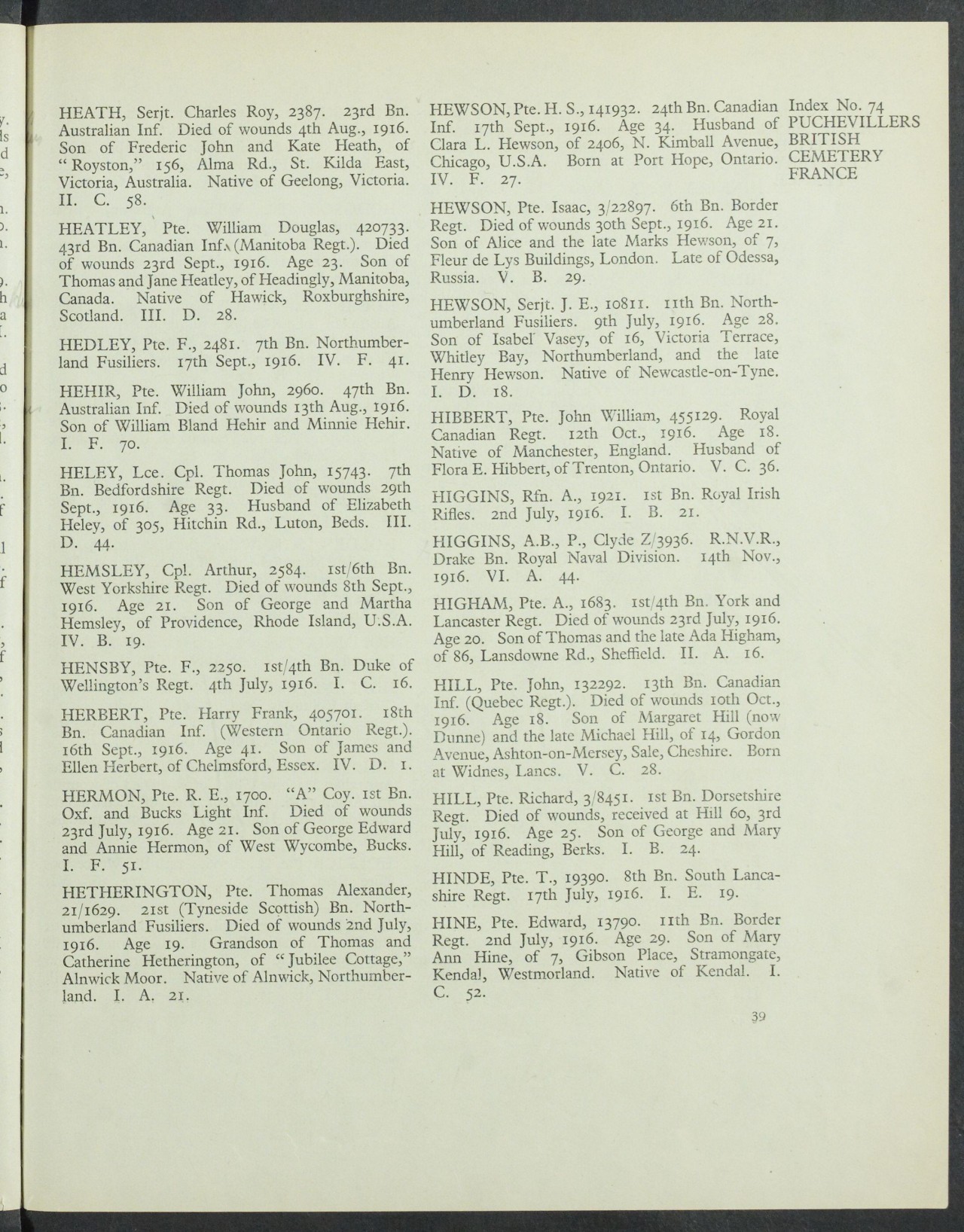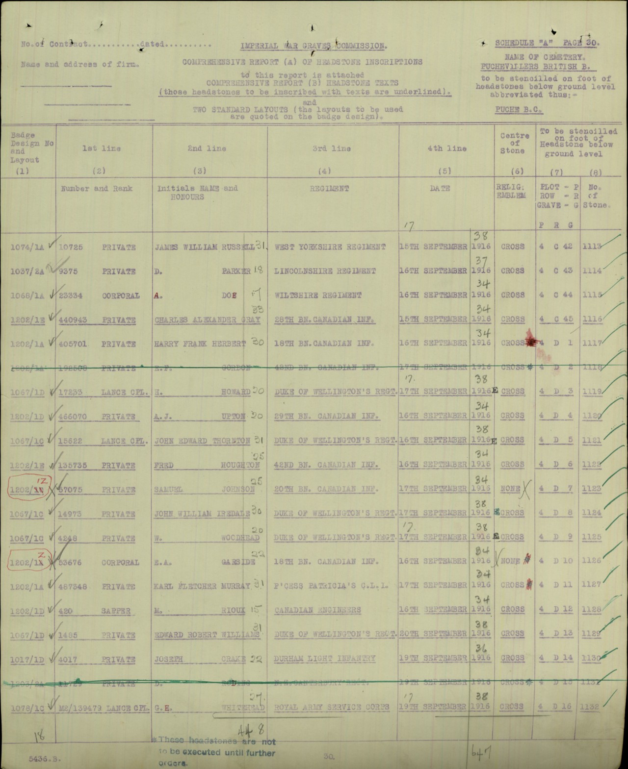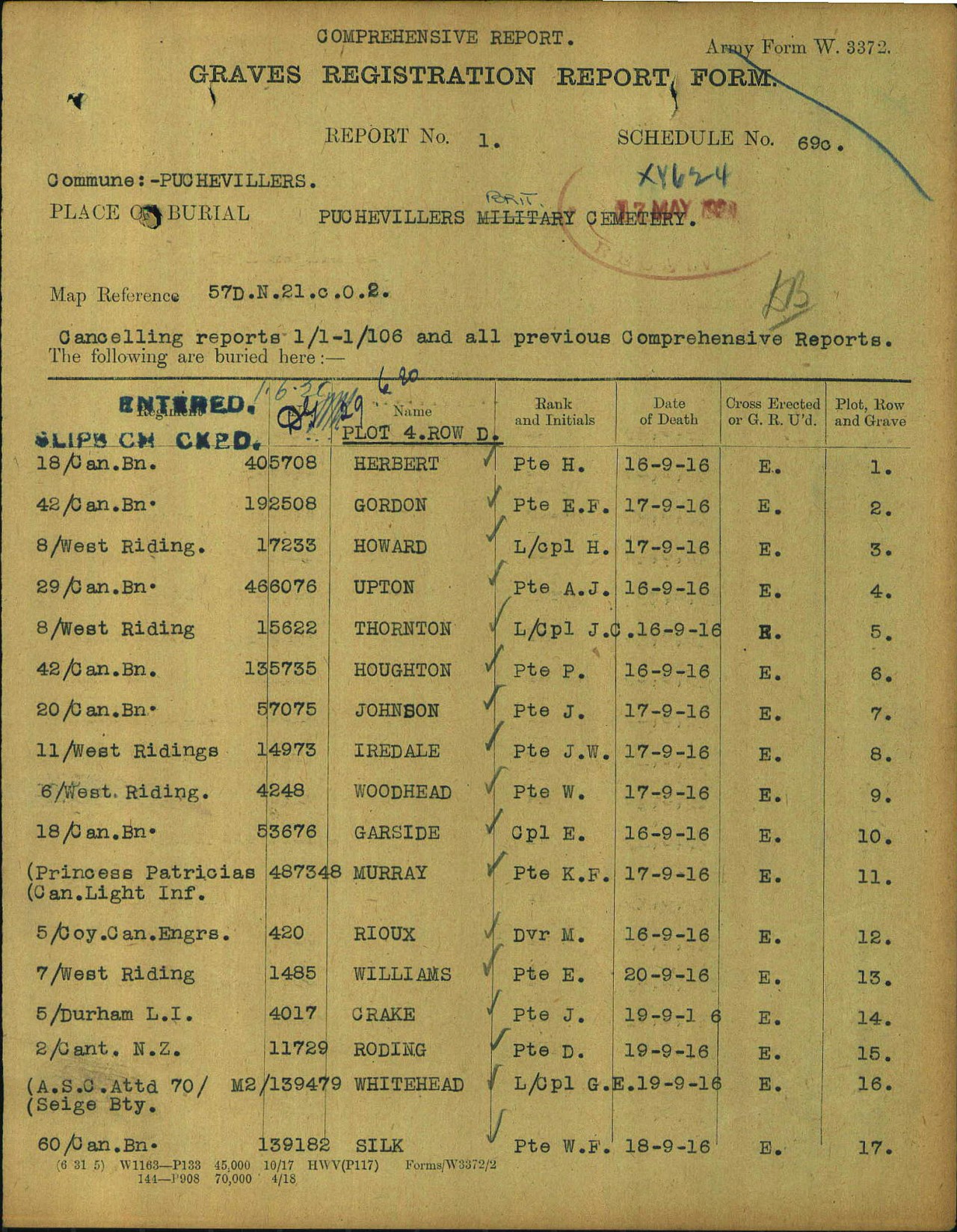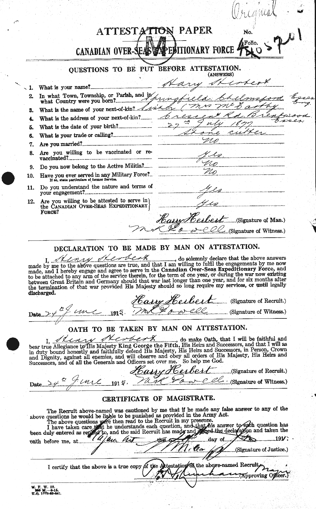 Family Search: When Private Harry Frank Herbert was born on 27 July 1875, in Springfield, Essex, England, United Kingdom, his father, James Herbert, was 31 and his mother, Ellen Jane Gamblyn, was 31. He lived in Brentwood, Essex, England, United Kingdom in 1891. He registered for military service in 1915. In 1915, at the age of 40, his occupation is listed as stone mason. He died on 16 September 1916, in Courcelette, Somme, France, at the age of 41, and was buried in Puchevillers British Cemetery, Puchevillers, Somme, France.