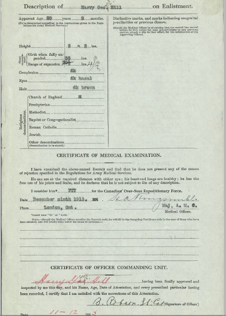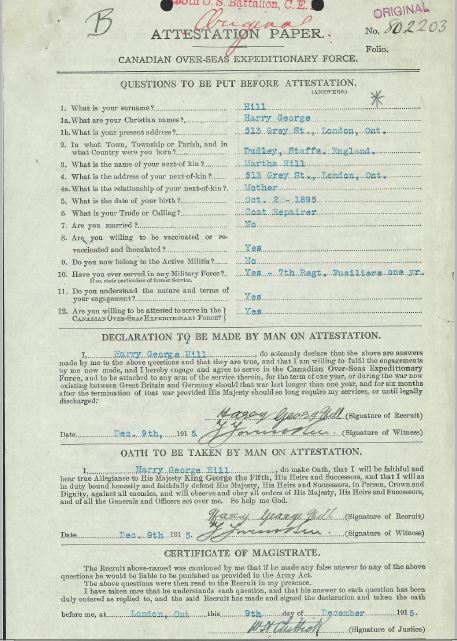 Family Search: When Private Harry George Hill was born on 2 October 1895, in Dudley, Worcestershire, England, United Kingdom, his father, Isaiah Hill, was 23 and his mother, Martha Hill, was 22. He immigrated to Quebec City, Quebec, Canada in 1911 and lived in Dudley, Staffordshire, England, United Kingdom for about 10 years and London, Ontario, Canada in 1915. He registered for military service in 1915. In 1915, at the age of 20, his occupation is listed as coat repairer in London, Ontario, Canada. He died on 11 November 1917, in Passendale, Zonnebeke, West Flanders, Belgium, at the age of 22.