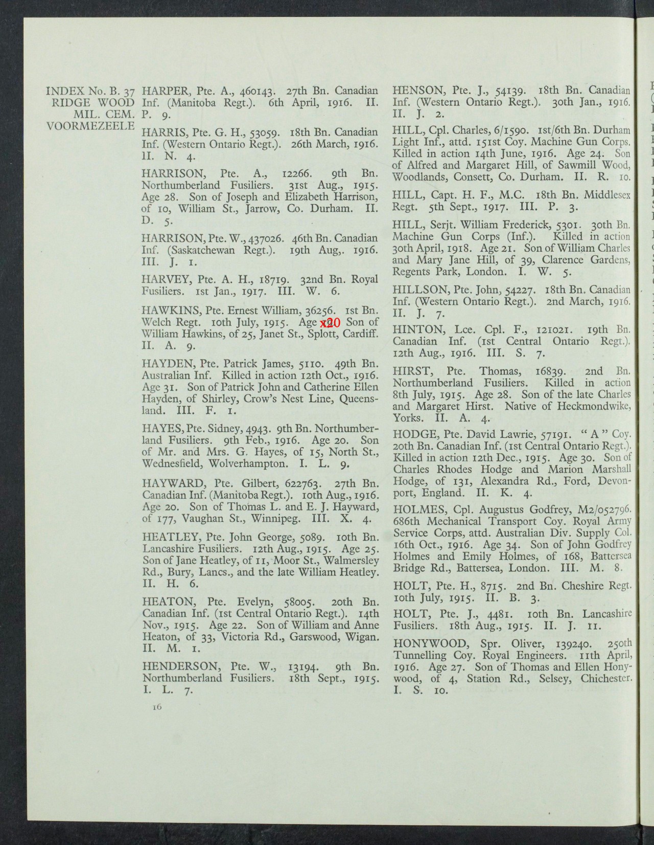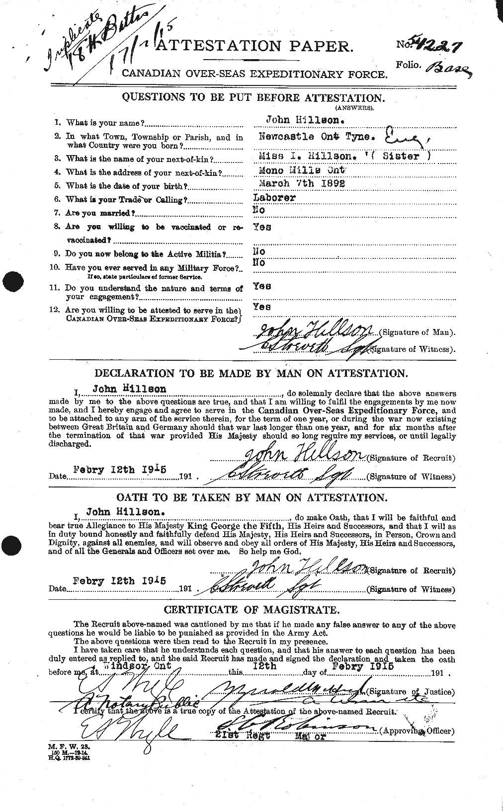 Family Search: Private John Hillson was born on 7 March 1892, in Newcastle upon Tyne, Tyne and Wear, England, United Kingdom. He immigrated to Quebec City, Quebec, Canada in 1907 and lived in Essex, Ontario, Canada in 1916. He registered for military service in 1915. In 1915, at the age of 23, his occupation is listed as labourer in Essex, Ontario, Canada. He died on 2 March 1916, in Ieper, West Flanders, Belgium, at the age of 23, and was buried in Ieper, West Flanders, Belgium.