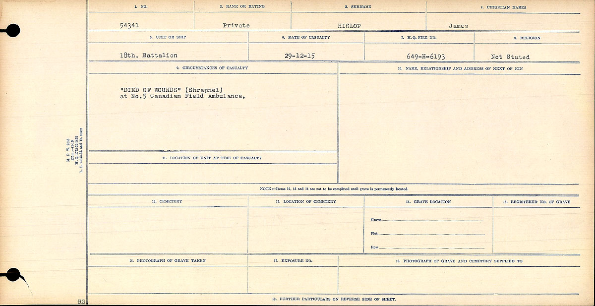 Graves Registration Report showing James Hislop was serving with the 18th Battalion at the time of death.