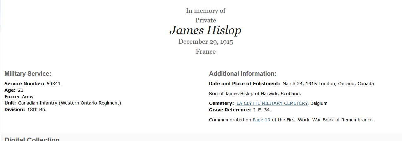 Family Search: Private James Hyslop was born on 22 April 1894, in Hawick, Scottish Borders, Scotland, United Kingdom as the son of James Hyslop. He immigrated to Canada in 1913. He registered for military service in 1915. In 1914, at the age of 20, his occupation is listed as boilermaker. He died on 29 December 1915, in Ieper, West Flanders, Belgium, at the age of 21, and was buried in Ieper, West Flanders, Belgium.