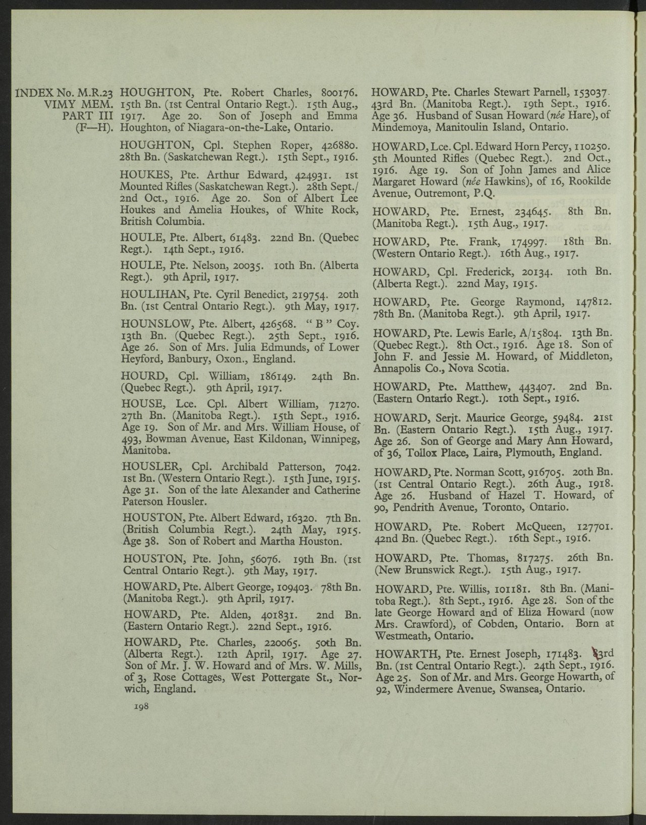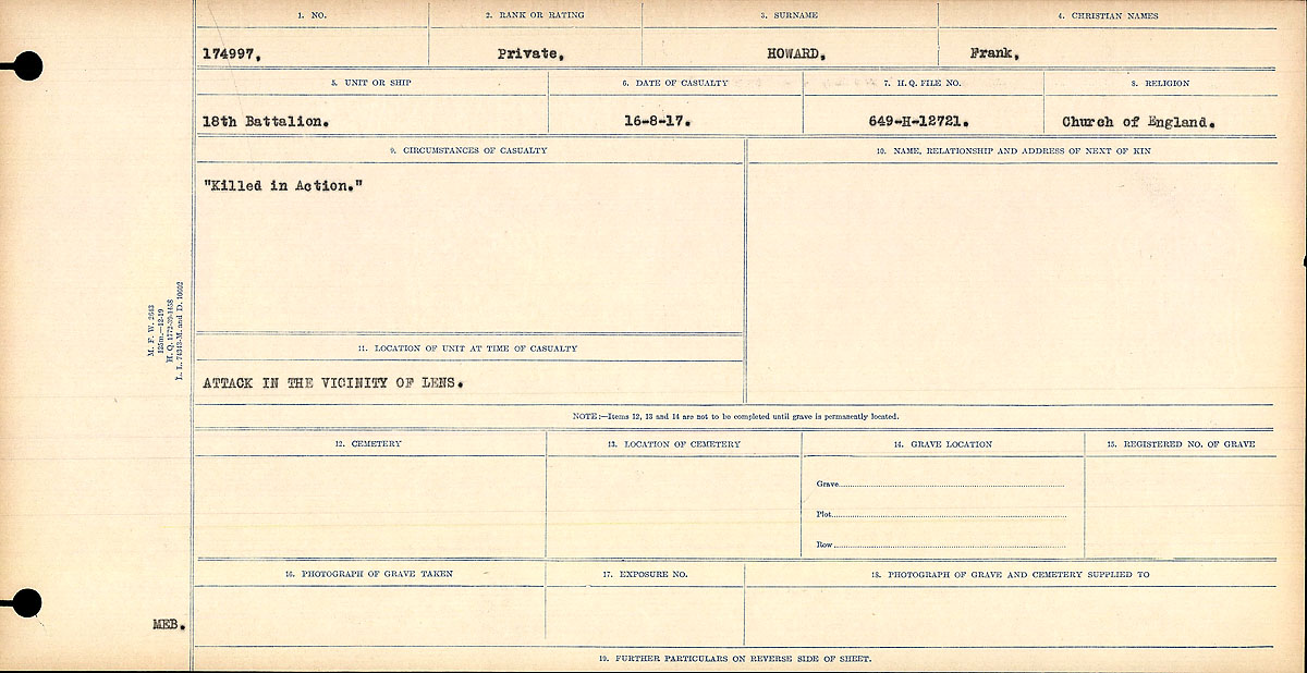 Howard, Frank: Service no. 174997 CVWM Page Digitized Service Record Source: August 1917 casualty. Find-A-Grave “Killed in Action” Share this: Click to email a link to a friend (Opens in new window) Email Click to share on Facebook (Opens in new window) Facebook Click to share on X (Opens in new window) X Click to share on Reddit (Opens in new window) Reddit Click to share on LinkedIn (Opens in new window) LinkedIn Click to print (Opens in new window) Print Click to share on Tumblr (Opens in new window) Tumblr Click to share on Pocket (Opens in new window) Pocket Click to share on Pinterest (Opens in new window) Pinterest Click to share on Telegram (Opens in new window) Telegram Click to share on WhatsApp (Opens in new window) WhatsApp Like Loading...