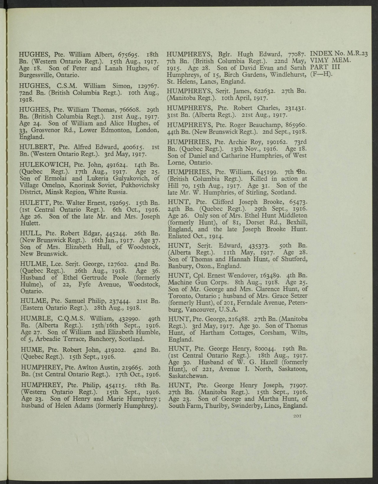 PTE. PHILIP HUMPHREY, 123 Carlton street, was killed in action September 15 [1916]. He enlisted here with the 59th Battalion in May last year, and went overseas in November. He reached the trenches before Christmas with a draft from another battalion, but was gassed and sent back to England for a few weeks. He returned to the trenches again, but was sent back to England ill. When he recovered he reached France once more for the last time, and was killed in September. Pte. Humphrey was 27 years old, and married. He was born in England and came to the city 12 years ago. He was employed as a caretaker for the Toronto Bicycle Club. His wife live at 423 Carlton street. There are no children.