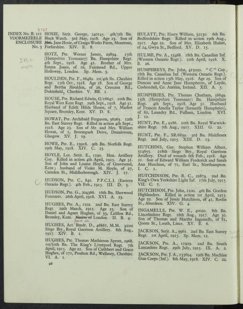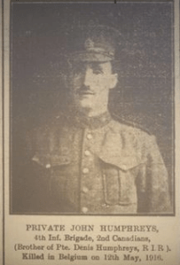 John Humphreys left Canada on the 17 June 1915 aboard the SS Missanabie and went to Shorncliffe Camp. He was in the Central Military Hospital, Shorncliffe from 7 September 1915 and underwent surgery for appendicitis. Thereafter he was cared for by the Charing VAD until his release to light duties. He went to France after the 20 January 1916 and wasn’t with his unit, ‘C’ Company, 18th Battalion, Canadian Infantry, until the 4 February 1916. He was killed in action about four months later on the 13th May 1916. The Circumstances of Death Register says, ‘He was with two comrades sitting in the bay of a trench in front of St Eloi, about one am on May 13th, 1916, when a shell burst amongst them instantly killing Private Humphreys and one other.’