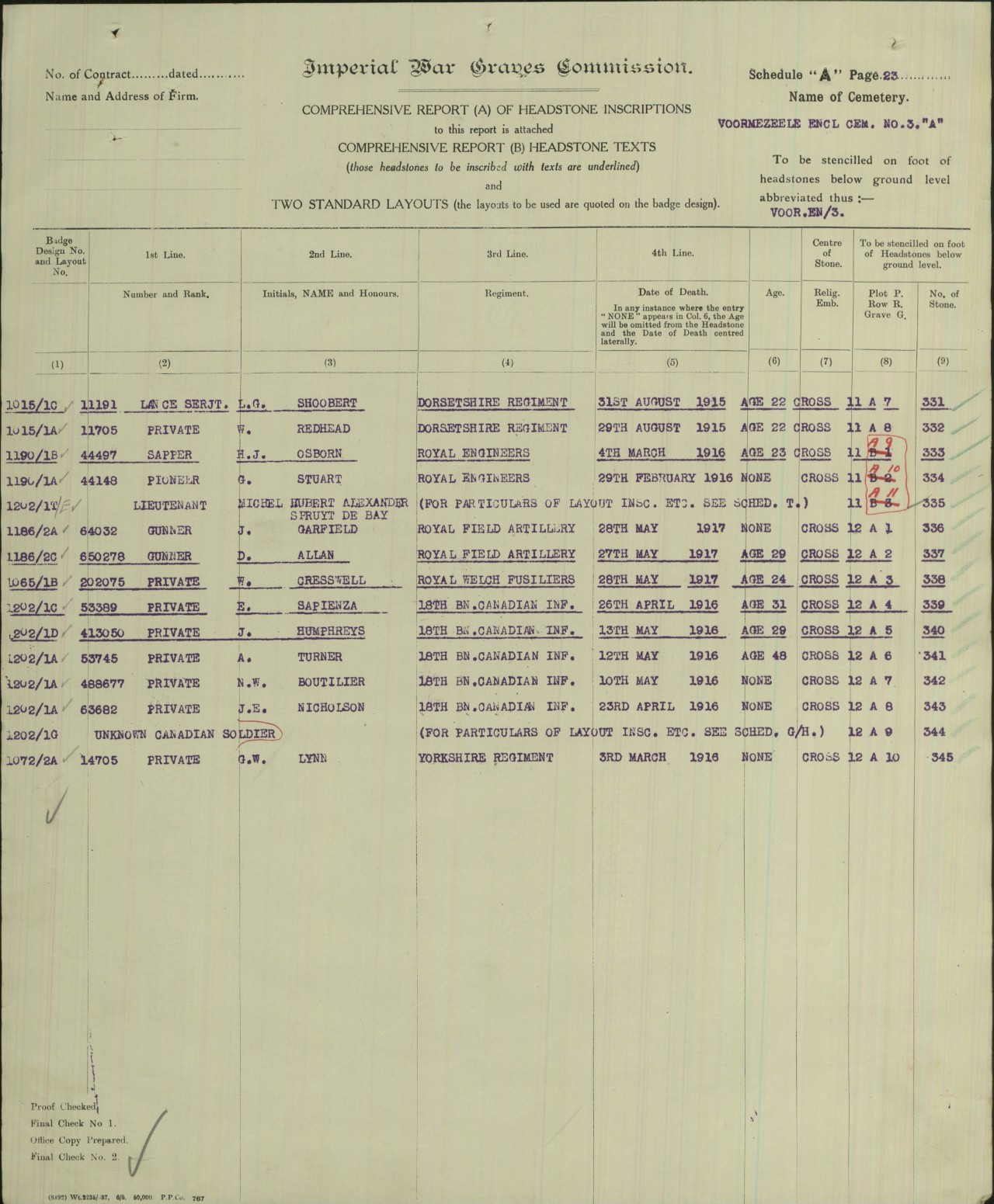 | On or About May 15, 1916 | Interred | Buried at Voormezeele Enclosure at grave XXX. His epitaph states HIS SERVANT SHALL SERVE HIM AND THEY SHALL SEE HIS FACE REV. 22. 3 & 4. He is buried with 13 other members of the 18th Battalion. |