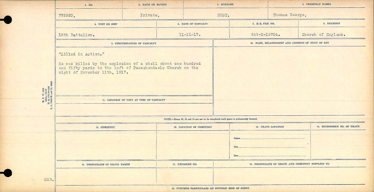Hunt, Thomas George: Service no. 775920 CVWM Page Digitized Service Record CWGC Page Source: November 1917 casualty. Find-A-Grave Memorial Plaque. Source Marika Pirie via CVWM. “Killed in Action” He was killed by the explosion of a shell about one hundred and fifty yards to the left of Passchendaele Church on the night of November 11, 1917. Share this: Click to email a link to a friend (Opens in new window) Email Click to share on Facebook (Opens in new window) Facebook Click to share on X (Opens in new window) X Click to share on Reddit (Opens in new window) Reddit Click to share on LinkedIn (Opens in new window) LinkedIn Click to print (Opens in new window) Print Click to share on Tumblr (Opens in new window) Tumblr Click to share on Pocket (Opens in new window) Pocket Click to share on Pinterest (Opens in new window) Pinterest Click to share on Telegram (Opens in new window) Telegram Click to share on WhatsApp (Opens in new window) WhatsApp Like Loading...
