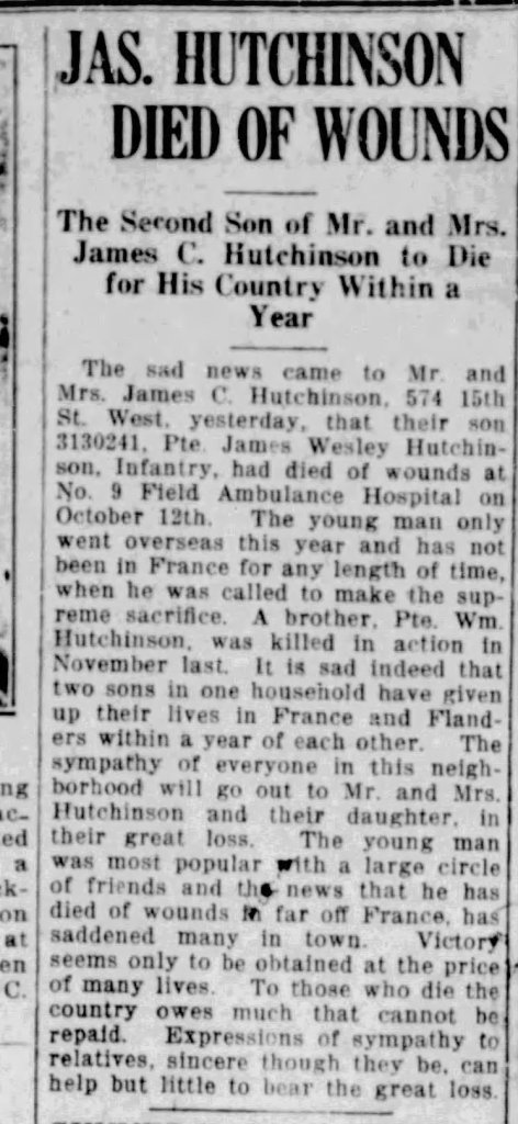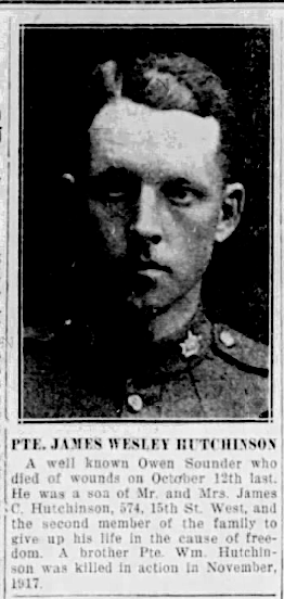 Family Search: When James Wesley Hutchison was born on 21 June 1889, in Derby, Grey, Ontario, Canada, his father, James Hutchison, was 30 and his mother, Hannah Campion, was 32. He lived in Ontario, Canada in 1889 and Grey, Ontario, Canada in 1901. He registered for military service in 1918. In 1918, at the age of 29, his occupation is listed as sash and door maker. He died on 10 October 1918, in Denain, Nord, Nord-Pas-de-Calais, France, at the age of 29, and was buried in Tilloy-lez-Cambrai, Nord, Nord-Pas-de-Calais, France.