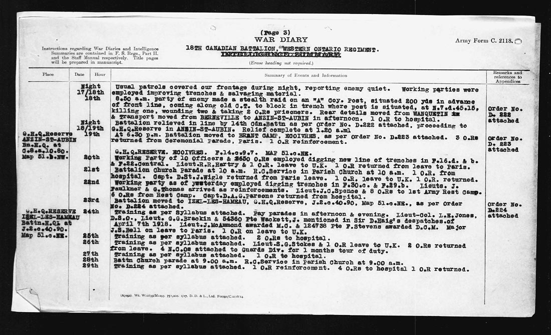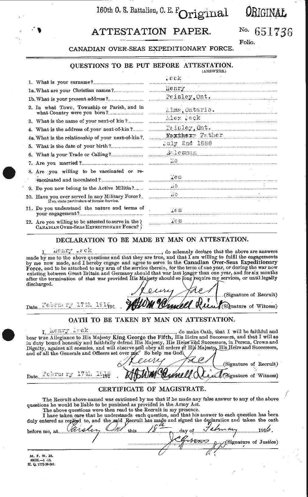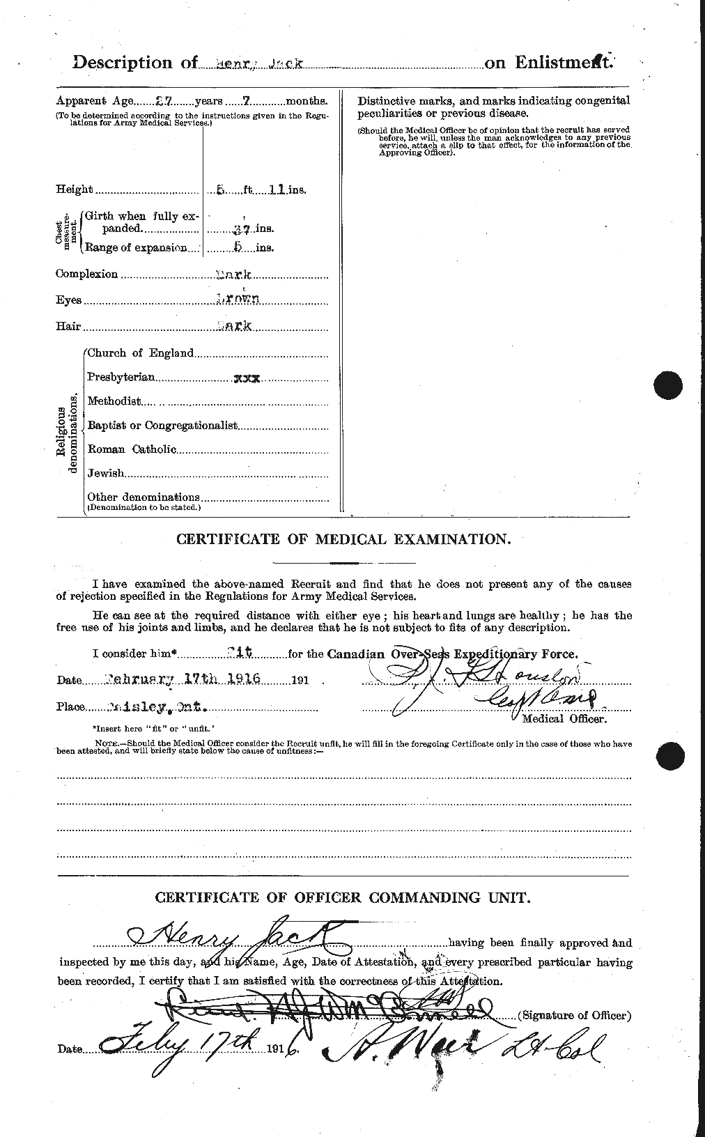 Became a prisoner of war (POW) July 18, 1918. The other soldier taken prisoner was Private James Thomas Fishel, reg. no. 929039. Private Fishel survived the war. Private Henry Jack is recorded to have been killed while escaping his German captors.