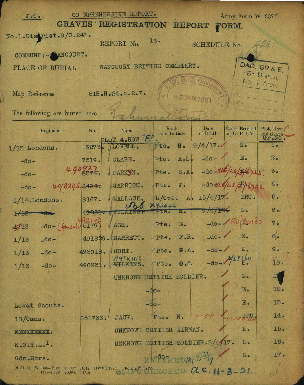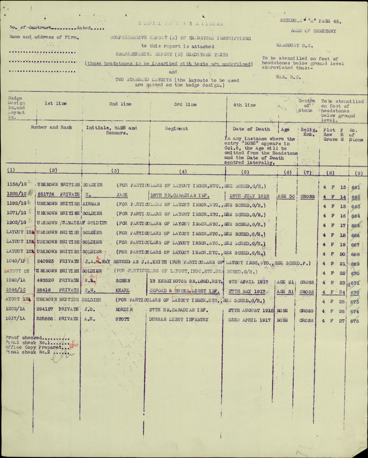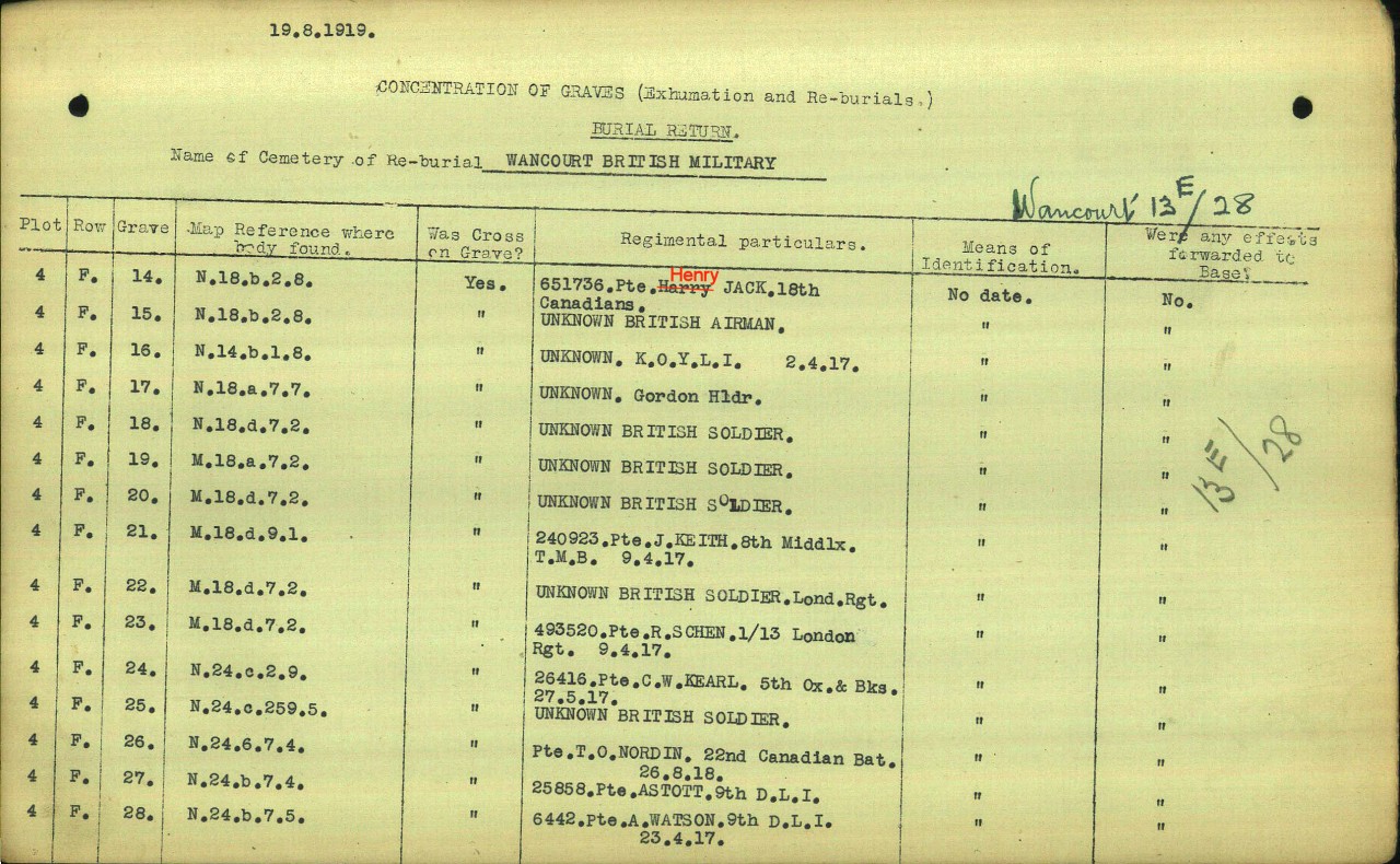 Family Search: When Private Henry Jack was born on 2 July 1888, in Alma, Mapleton, Wellington, Ontario, Canada, his father, Alexander Jack, was 43 and his mother, Margaret Scott, was 42. He lived in Bruce, Ontario, Canada for about 10 years and Paisley, Bruce, Ontario, Canada in 1916. He registered for military service in 1916. In 1916, at the age of 28, his occupation is listed as salesman in Paisley, Bruce, Ontario, Canada. He died on 18 July 1918, in Arras, Pas-de-Calais, France, at the age of 30, and was buried in Wancourt British Cemetery, Wancourt, Pas-de-Calais, Nord-Pas-de-Calais, France.