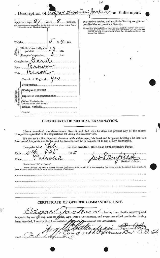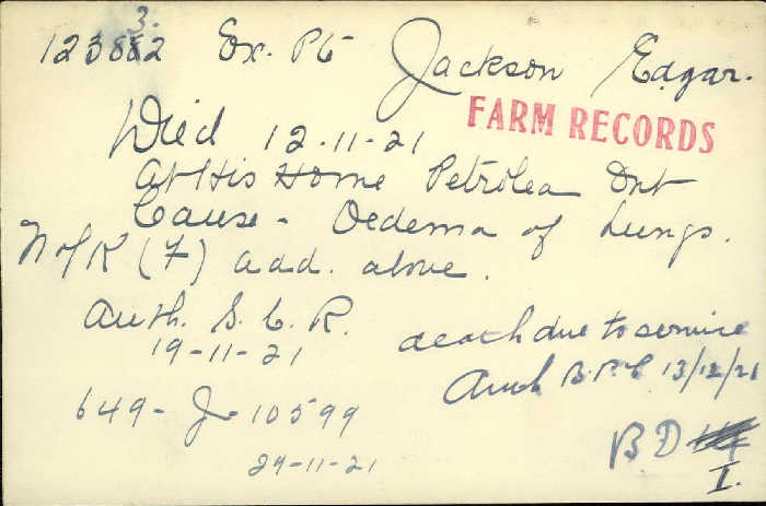 Family Search: When Private Edgar Harrison Jackson was born on 20 January 1888, in Petrolia, Lambton, Ontario, Canada, his father, George William Jackson, was 34 and his mother, Mary Martha Harrison, was 30. He lived in Lambton, Ontario, Canada in 1901. He registered for military service in 1915. In 1915, at the age of 27, his occupation is listed as refiner. He died on 12 November 1921, in Petrolia, Lambton, Ontario, Canada, at the age of 33, and was buried in Hillsdale Cemetery, Petrolia, Lambton, Ontario, Canada.