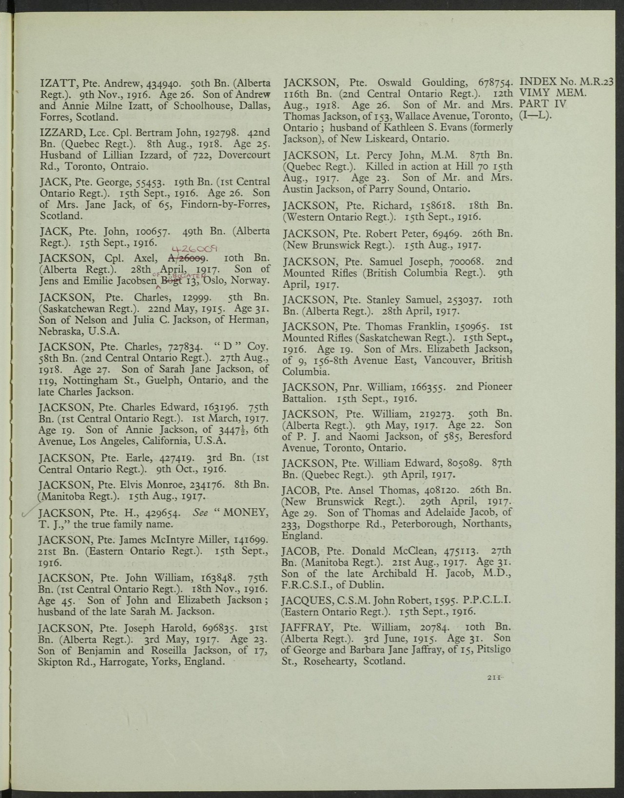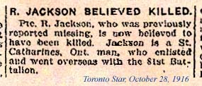 Pte. R. Jackson, who was previously reported missing, is now believed to have been killed. Jackson is a St. Catharines, Ont. man, who enlisted and went overseas with the 81st Battalion.
