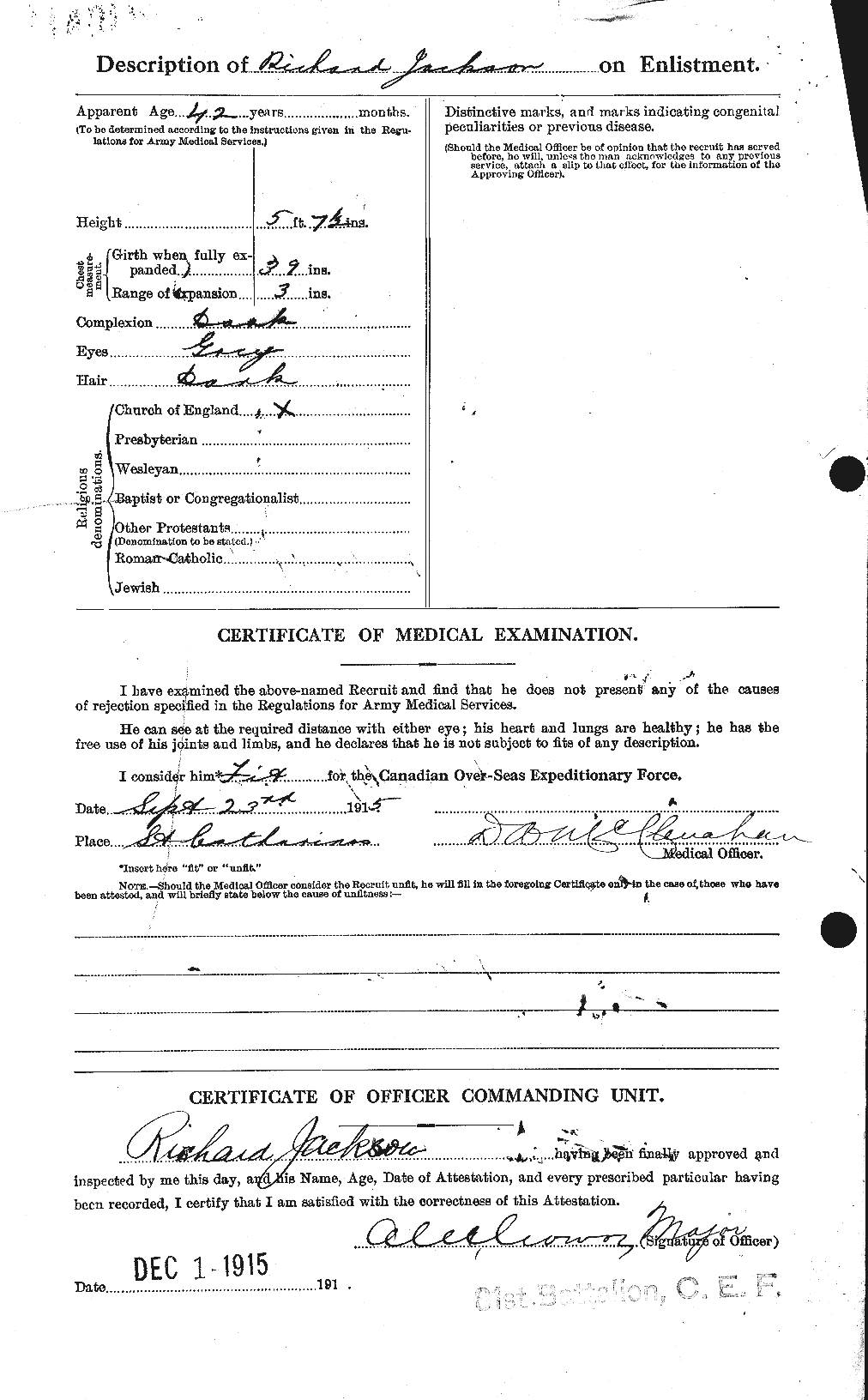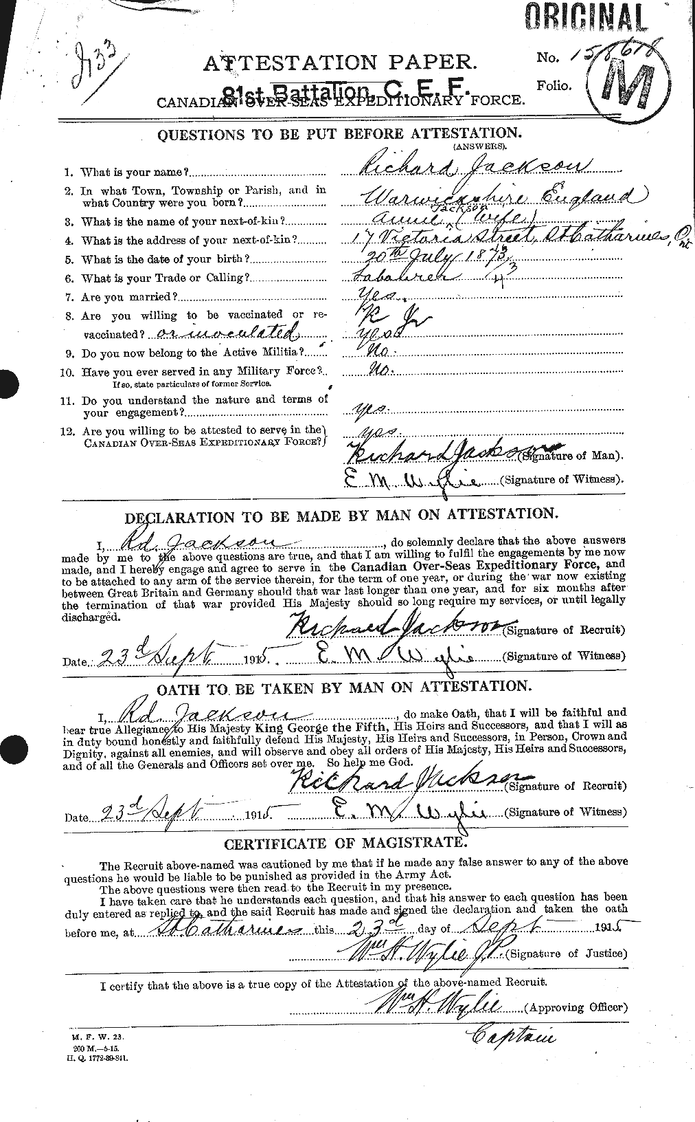 Family Search: Private Richard Jackson was born on 20 July 1873, in Warwickshire, England, United Kingdom. He had at least 1 son and 3 daughters with Annie Tinsley. He immigrated to Canada in 1904 and lived in Lincoln, Ontario, Canada in 1911 and St. Catharines, Lincoln, Ontario, Canada in 1915. He registered for military service in 1915. In 1915, at the age of 42, his occupation is listed as labourer, newman brothers in St. Catharines, Lincoln, Ontario, Canada. He died on 15 September 1916, in Courcelette, Somme, France, at the age of 43.
