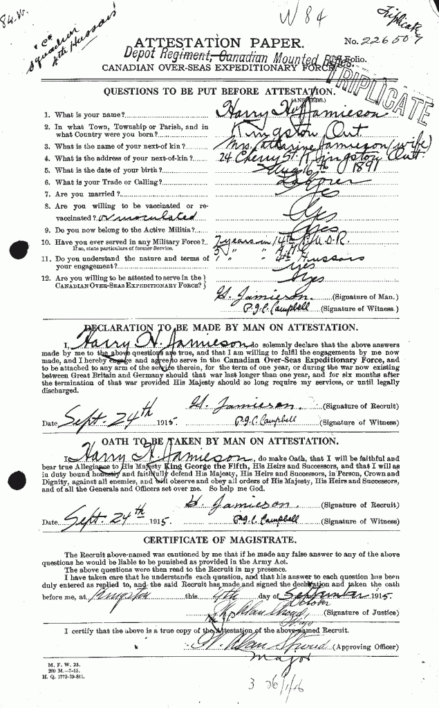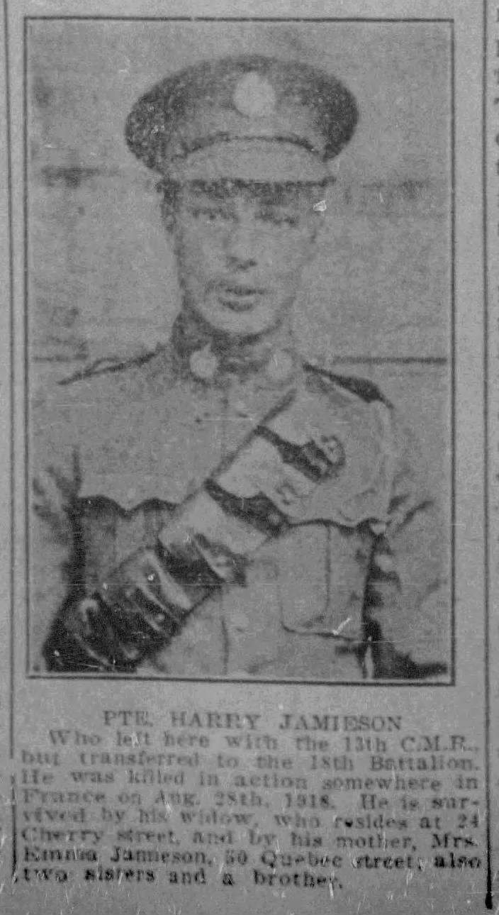 Family Search: When Lance-Corporal Harry Hugh Jamieson was born on 16 April 1891, in Kingston Township, Frontenac, Ontario, Canada, his father, Thomas Jamieson, was 38 and his mother, Elizabeth Jamison, was 25. He married Catherine Burke on 16 January 1914, in Kingston, Frontenac, Ontario, Canada. He registered for military service in 1915. In 1915, at the age of 24, his occupation is listed as labourer. He died on 28 August 1918, in Vis-en-Artois, Pas-de-Calais, Hauts-de-France, France, at the age of 27, and was buried in Pas-de-Calais, Nord-Pas-de-Calais, France.