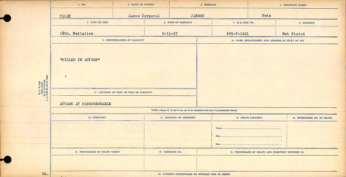 Janson, Peter: Service no. 53128 CVWM Page Digitized Service Record CWGC Page Source: November 1917 casualty. Find-A-Grave Swedish. Mentioned in the post. Source: Operation Picture Me via The 18th Battalion Facebook Group. London Free Press. December 14, 1917. “Killed in Action.” Share this: Click to email a link to a friend (Opens in new window) Email Click to share on Facebook (Opens in new window) Facebook Click to share on X (Opens in new window) X Click to share on Reddit (Opens in new window) Reddit Click to share on LinkedIn (Opens in new window) LinkedIn Click to print (Opens in new window) Print Click to share on Tumblr (Opens in new window) Tumblr Click to share on Pocket (Opens in new window) Pocket Click to share on Pinterest (Opens in new window) Pinterest Click to share on Telegram (Opens in new window) Telegram Click to share on WhatsApp (Opens in new window) WhatsApp Like Loading...