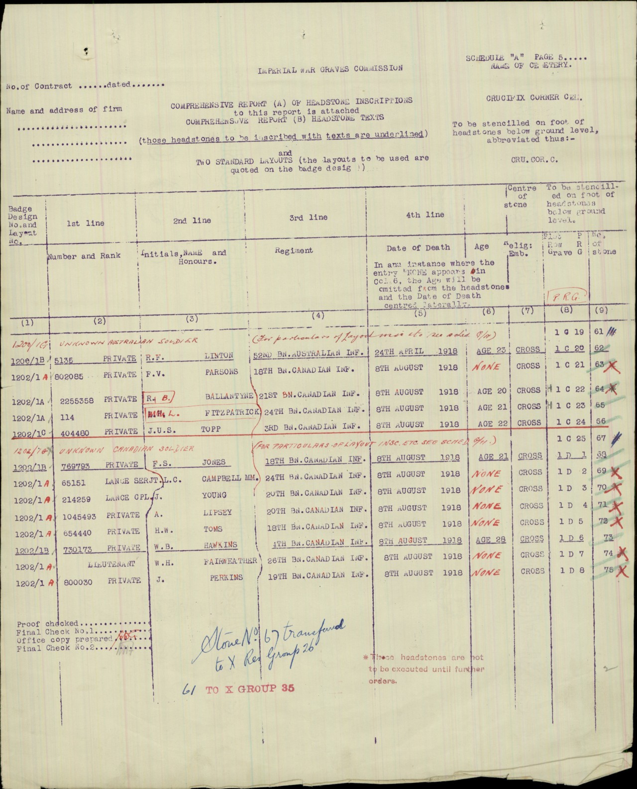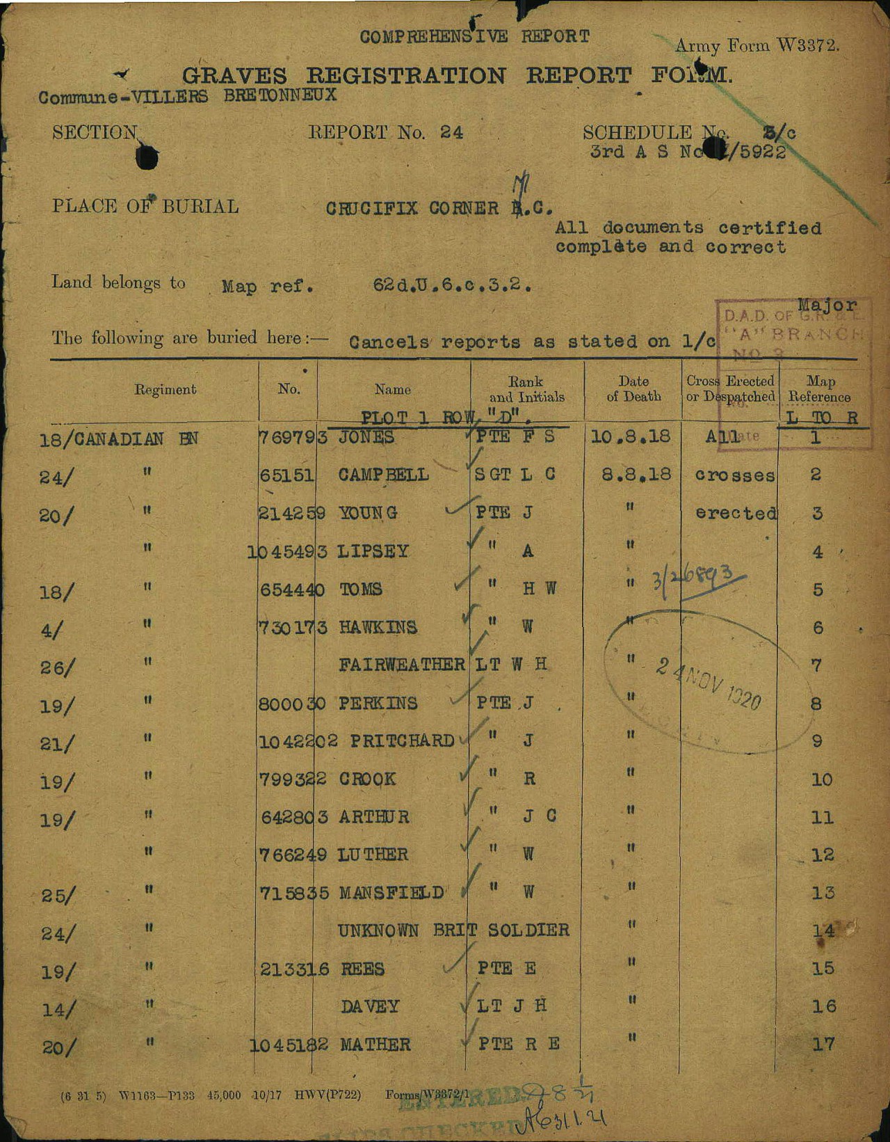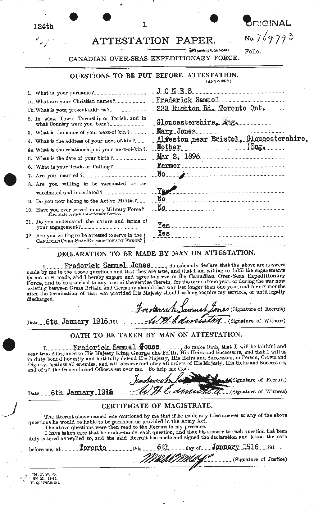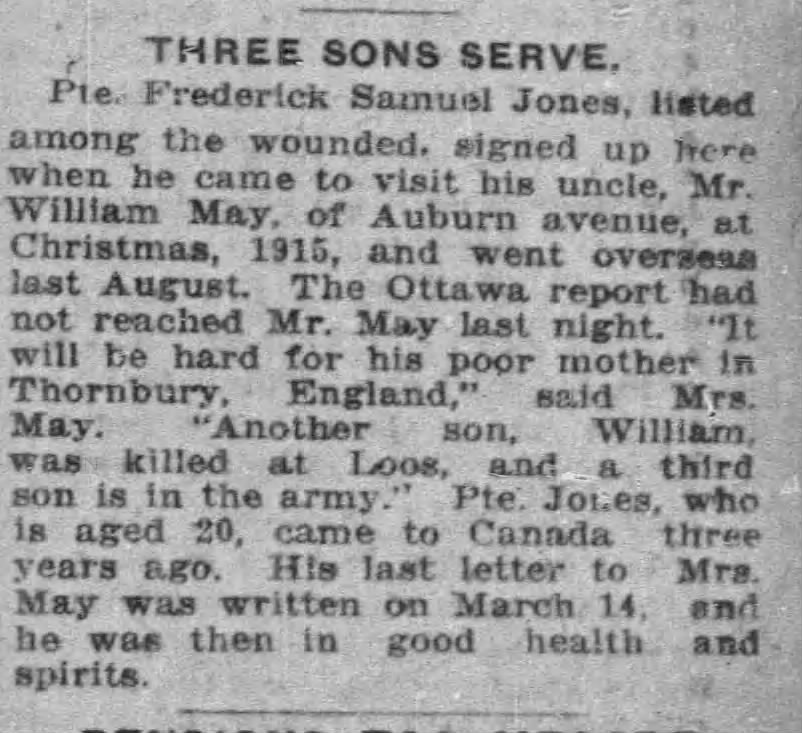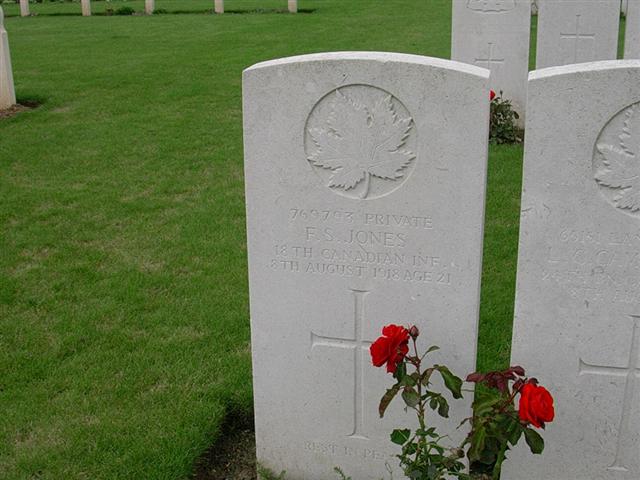 Family Search: Private Frederick Samuel Jones was born on 2 March 1896, in Gloucestershire, England, United Kingdom as the son of George Jones and Mary Ann. He immigrated to Canada in 1913 and lived in Alveston, Gloucestershire, England, United Kingdom in 1911 and Toronto, York, Ontario, Canada in 1916. He registered for military service in 1916. In 1916, at the age of 20, his occupation is listed as farmer in Toronto, York, Ontario, Canada. He died on 8 August 1918, in Amiens, Somme, France, at the age of 22, and was buried in Villers-Bretonneux, Somme, France.