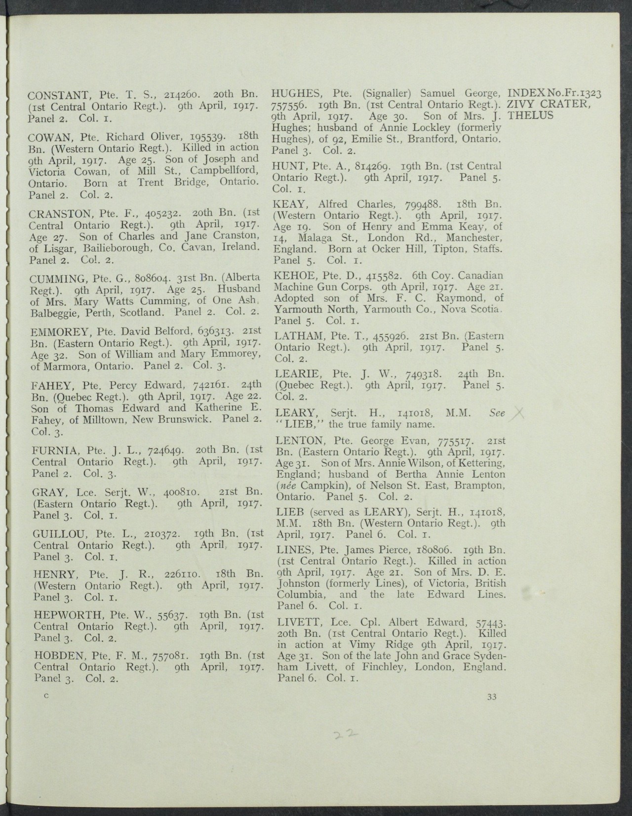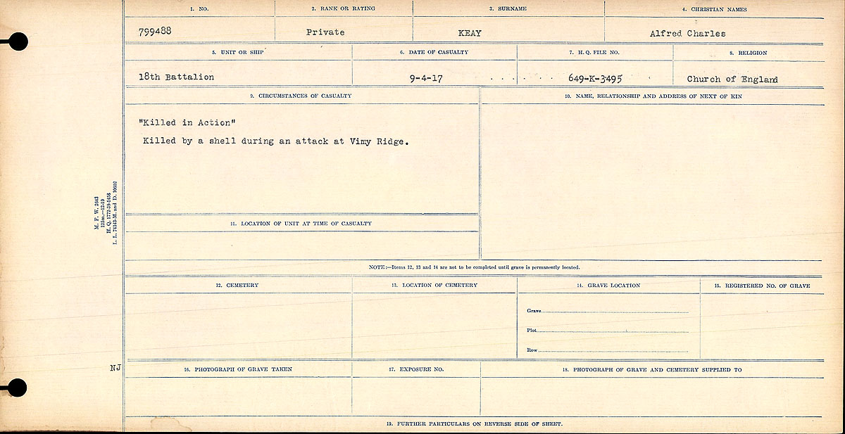 Keay, Alfred Charles: Service no. 799488 CVWM Page Digitized Service Record Source: April 1917 casualty. Find-A-Grave Inscription – A photograph of the memorial wall at the Zivy Crater Cemetery. May he rest in peace.(J.Stephens). Source: CVWM “Killed in Action” Killed by a shell during an attack at Vimy Ridge. Share this: Click to email a link to a friend (Opens in new window) Email Click to share on Facebook (Opens in new window) Facebook Click to share on X (Opens in new window) X Click to share on Reddit (Opens in new window) Reddit Click to share on LinkedIn (Opens in new window) LinkedIn Click to print (Opens in new window) Print Click to share on Tumblr (Opens in new window) Tumblr Click to share on Pocket (Opens in new window) Pocket Click to share on Pinterest (Opens in new window) Pinterest Click to share on Telegram (Opens in new window) Telegram Click to share on WhatsApp (Opens in new window) WhatsApp Like Loading...