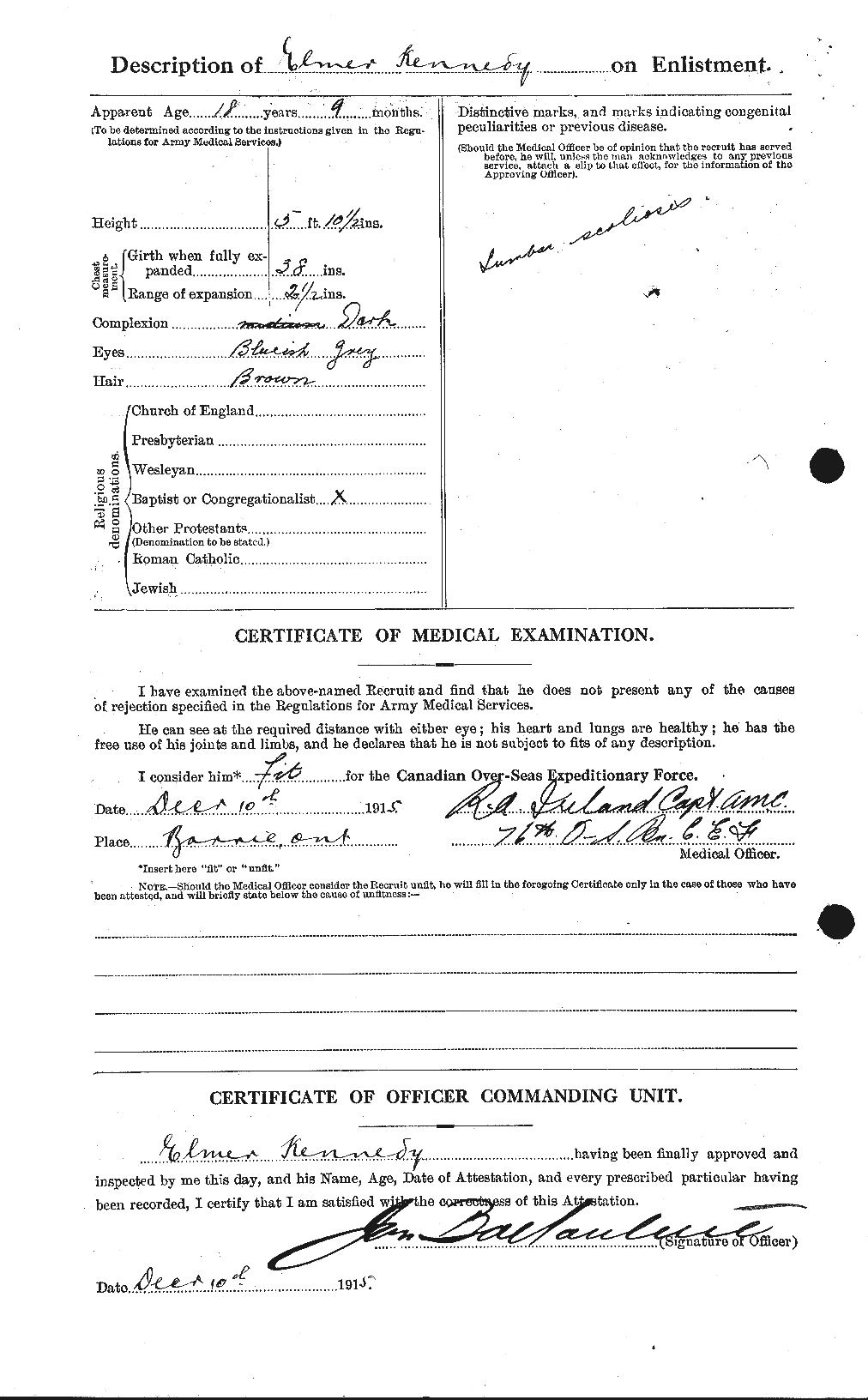 Family Search: Private Elmer John Kennedy was born on 9 March 1897, in Burk’s Falls, Parry Sound, Ontario, Canada as the son of William Cyrus Kennedy and Annie Mckinley. He registered for military service in 1915. In 1915, at the age of 18, his occupation is listed as farmer. He died on 15 September 1916, in Courcelette, Somme, Picardie, France, at the age of 19.