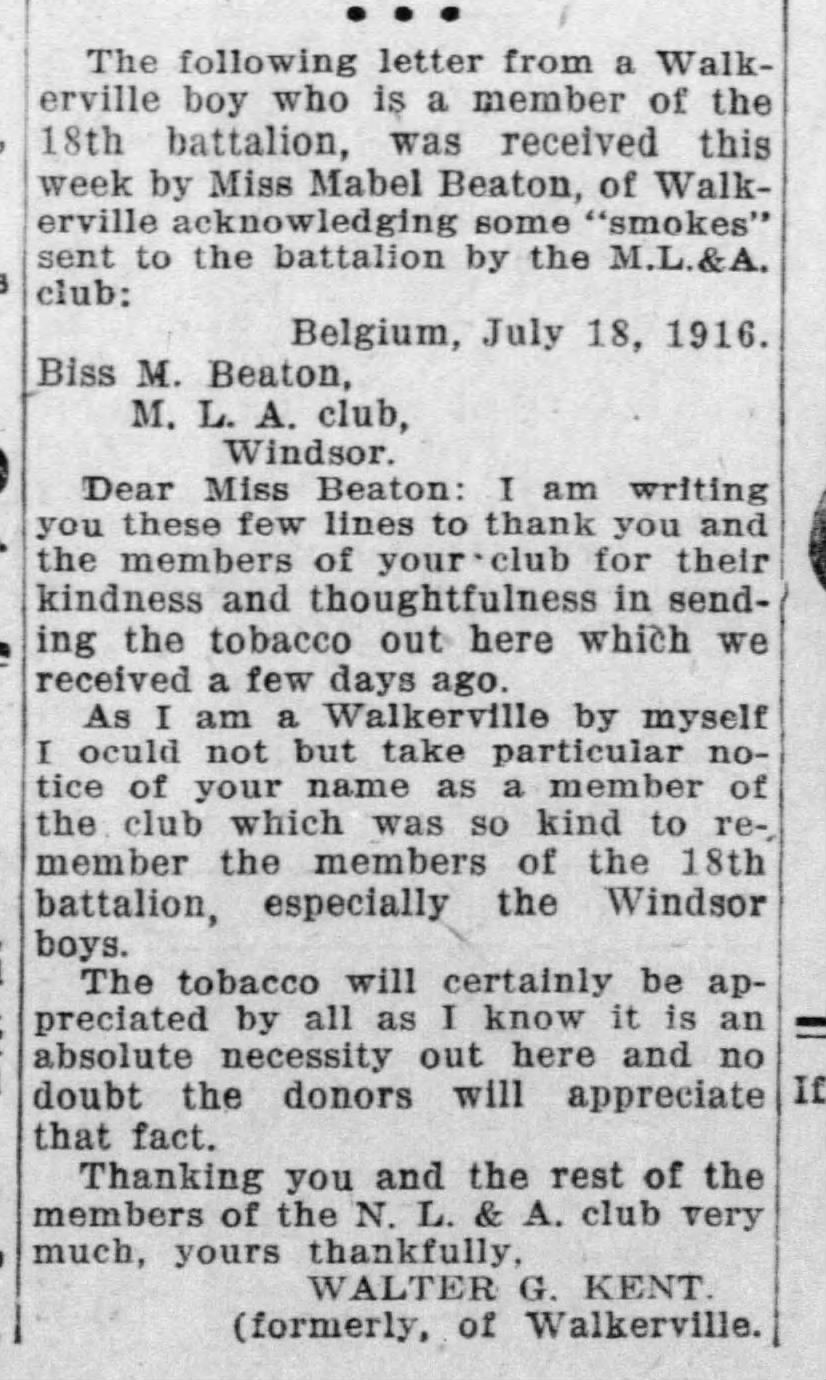 PTE. W.G. KENT, whose sister lives at 19 Clarendon avenue, reported to-day as killed, enlisted with a unit from Windsor, and has been in the trenches for a year. His home was at Walkerville, but before enlistment, he was with the Royal North-West Mounted Police.