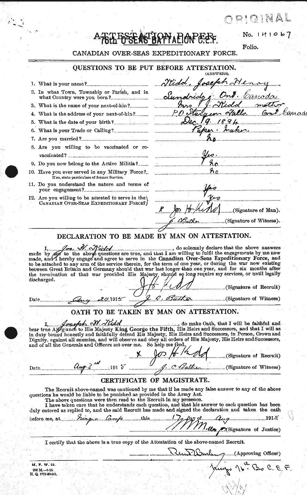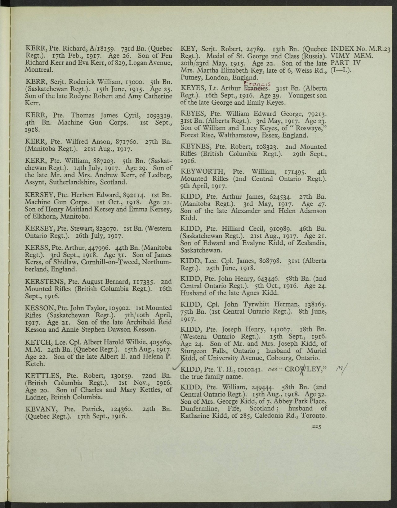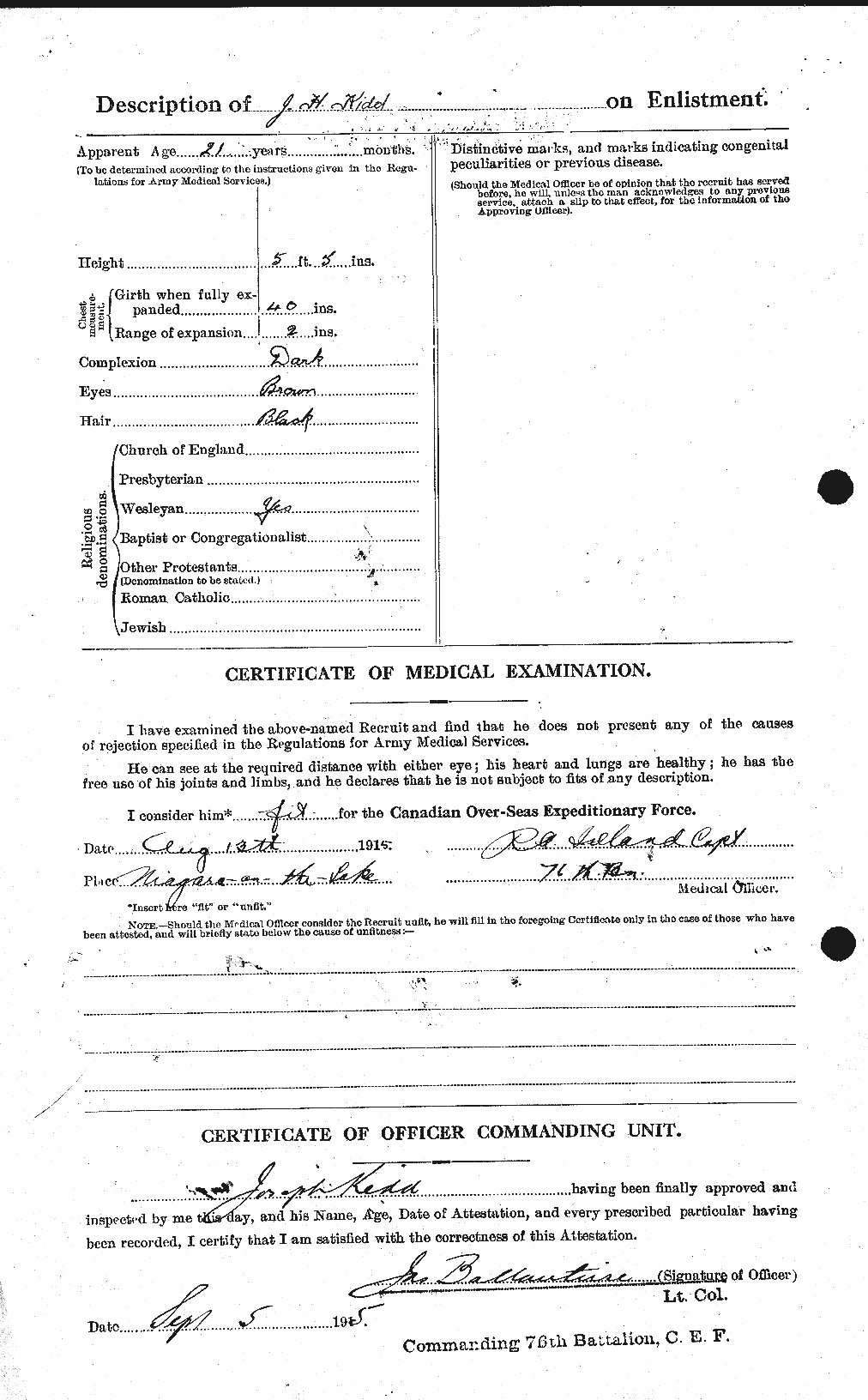 Family Search: When Private Joseph Henry Kidd was born on 9 December 1894, in Sundridge, Parry Sound, Ontario, Canada, his father, Joseph Henry Kidd, was 35 and his mother, Isabella Prudence Pinnel, was 34. He married Muriel Berry on 25 August 1915, in Sturgeon Falls, West Nipissing, Nipissing, Ontario, Canada. He lived in Nipissing, Ontario, Canada in 1911. He registered for military service in 1915. In 1915, at the age of 21, his occupation is listed as paper maker. He died on 15 September 1916, in Courcelette, Somme, Picardie, France, at the age of 21.