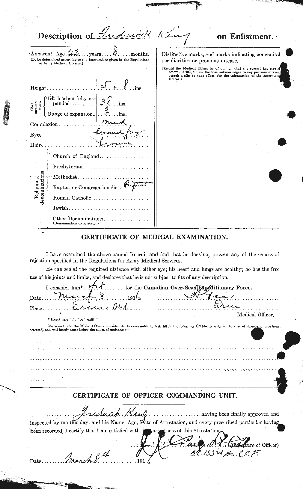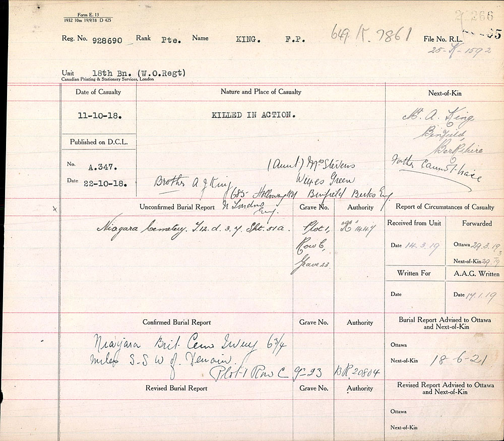 Family Search: When Private Frederick Parker King was born on 30 June 1892, in Soham, Cambridgeshire, England, United Kingdom, his father, Alfred King, was 30 and his mother, Mary Elizabeth Stevens, was 26. He immigrated to Canada in 1913. He registered for military service in 1916. In 1916, at the age of 24, his occupation is listed as farm labourer in Erin, Wellington, Ontario, Canada. He died on 11 October 1918, in Iwuy, Nord, Nord-Pas-de-Calais, France, at the age of 26, and was buried in Niagara Cemetery, Iwuy, Nord, Nord-Pas-de-Calais, France.