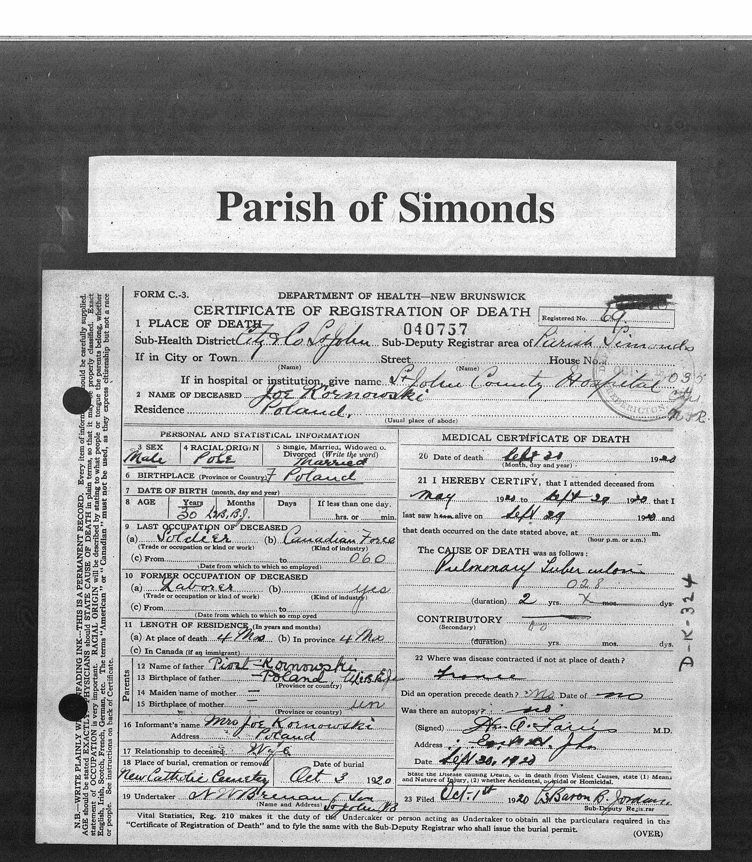 Family Search: Private Joseph Kornowski was born on 6 May 1893, in Poland as the son of Piort Kornowski. He immigrated to Canada in 1913 and lived in Chicago, Cook, Illinois, United States in 1919. He registered for military service in 1914. In 1914, at the age of 21, his occupation is listed as hospital orderly. He died on 30 September 1920, in Saint John, St. John, New Brunswick, Canada, at the age of 27, and was buried in Saint Josephs Cemetery, Saint John, St. John, New Brunswick, Canada.