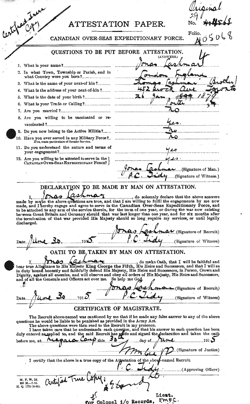 Private Jonas “Jack” Lashmar. Regimental No. 405068.