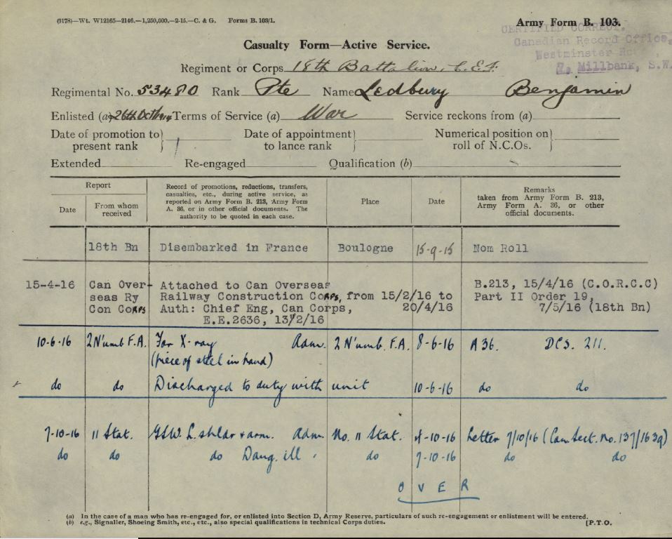101 years ago, on Oct. 26, 1914 Benjamin Ledbury, who attended Tillsonburg’s St. John’s Anglican Church, signed up in Woodstock to serve with the 18th Battalion of the Canadian Expeditionary Force.