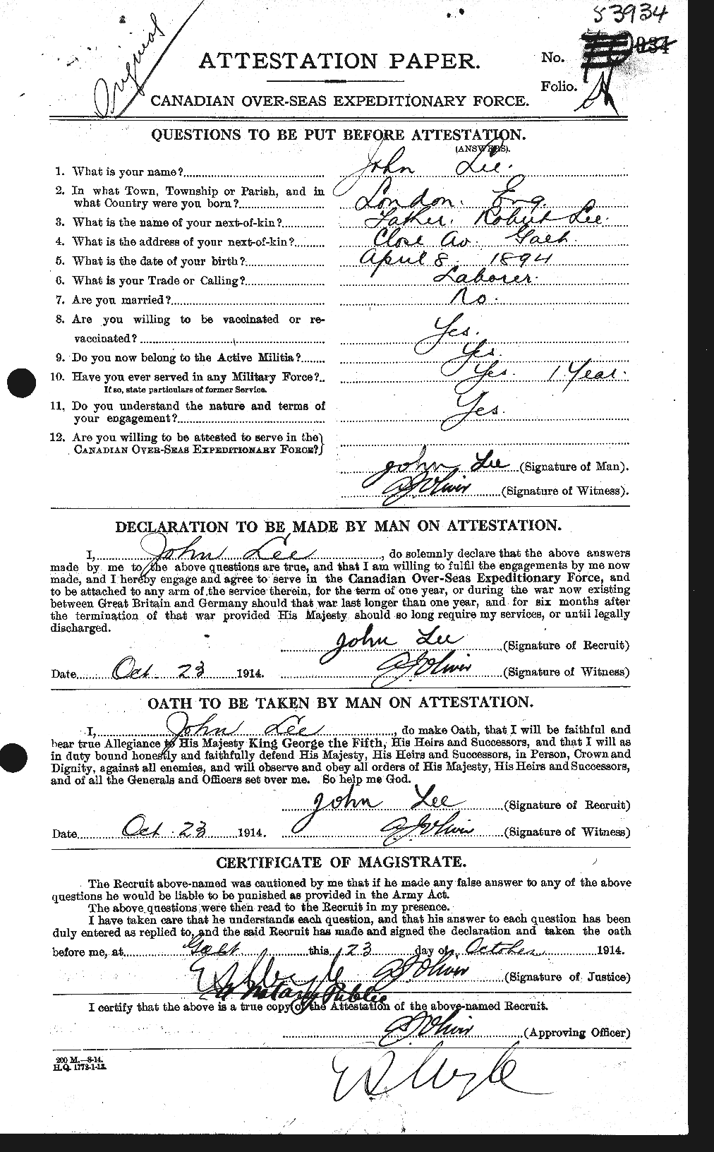Family Search: Private John Lee was born on 8 April 1894, in London, England, United Kingdom as the son of Robert Lee and A. Lee. He immigrated to Canada in 1913 and lived in Galt, Waterloo, Ontario, Canada in 1914. He registered for military service in 1914. In 1914, at the age of 20, his occupation is listed as labourer. He died on 15 September 1916, in Courcelette, Somme, Hauts-de-France, France, at the age of 22.