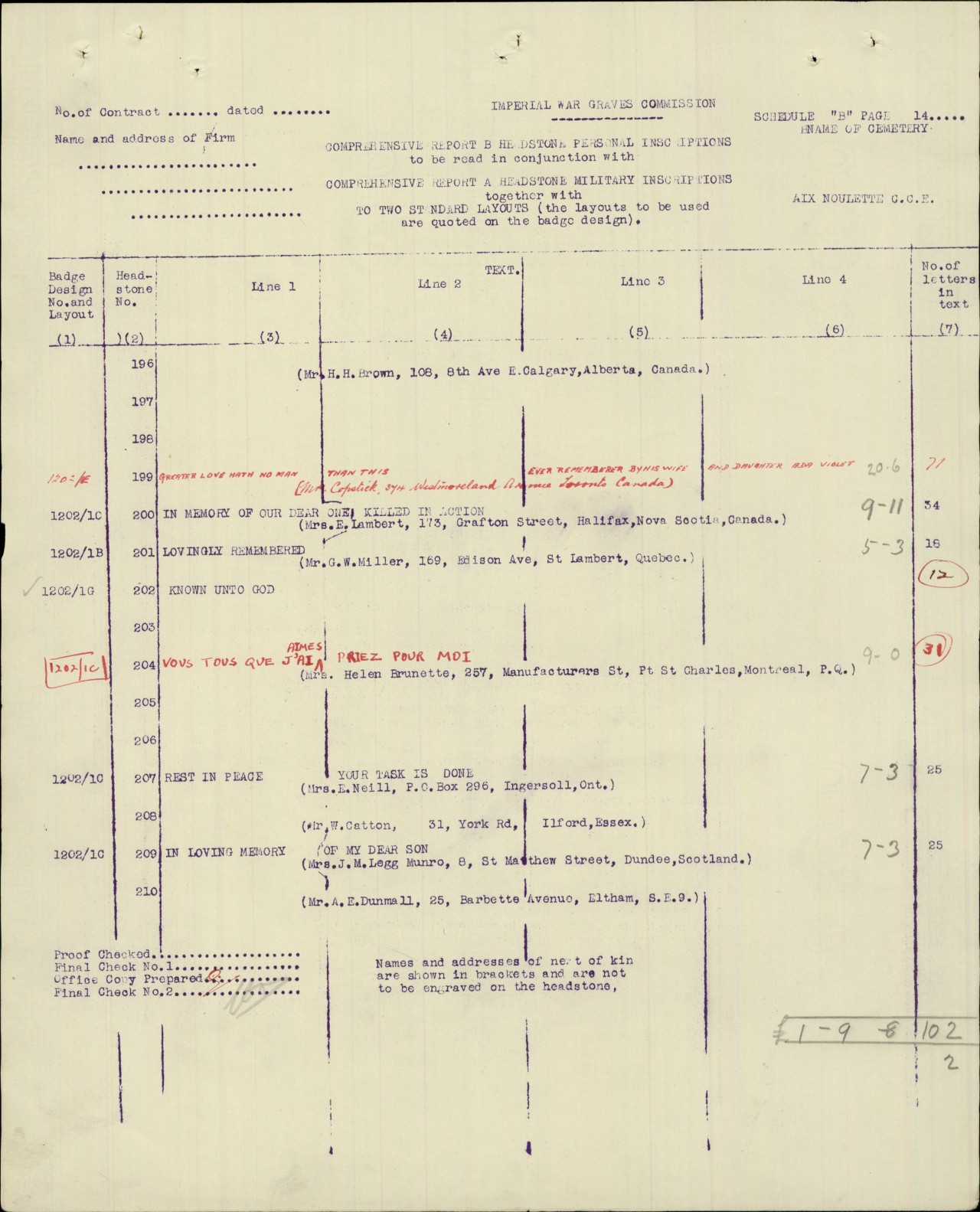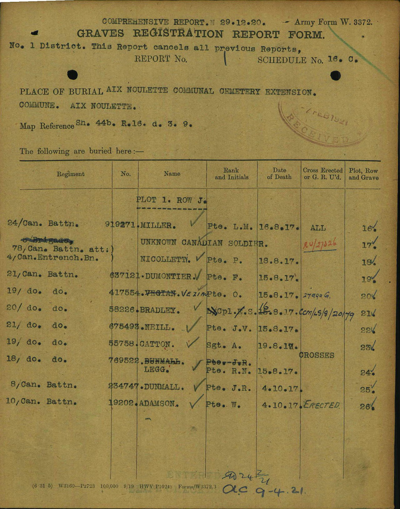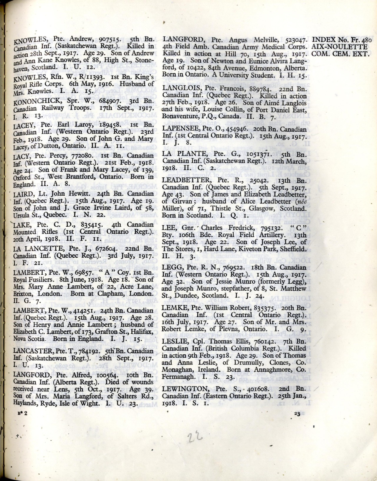 Family Search: Private Robert Neilson Legg was born on 20 September 1884, in Inverbervie, Kincardineshire, Scotland, United Kingdom as the son of Jessie Legg. He immigrated to Canada in 1910 and lived in Toronto, Ontario, Canada in 1916. He registered for military service in 1916. In 1916, at the age of 32, his occupation is listed as lineman in Toronto, Ontario, Canada. He died on 15 August 1917, in Lens, Pas-de-Calais, Hauts-de-France, France, at the age of 32, and was buried in Aix-Noulette, Pas-de-Calais, Nord-Pas-de-Calais, France.