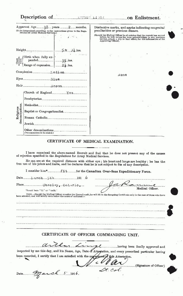 Private Arthur Linge was born at Stanhope, Norfolk, England on 16 January 1878 [1875], making him 38-years and 2-months old when he enlisted with the 160th Overseas Battalion at Chesley, Ontario. He was a “Packer in the Furniture Industry” and was not married at the time of his enlistment on 4 March 1916 he served in Canada until his unit sailed for England on 17 October 1916.