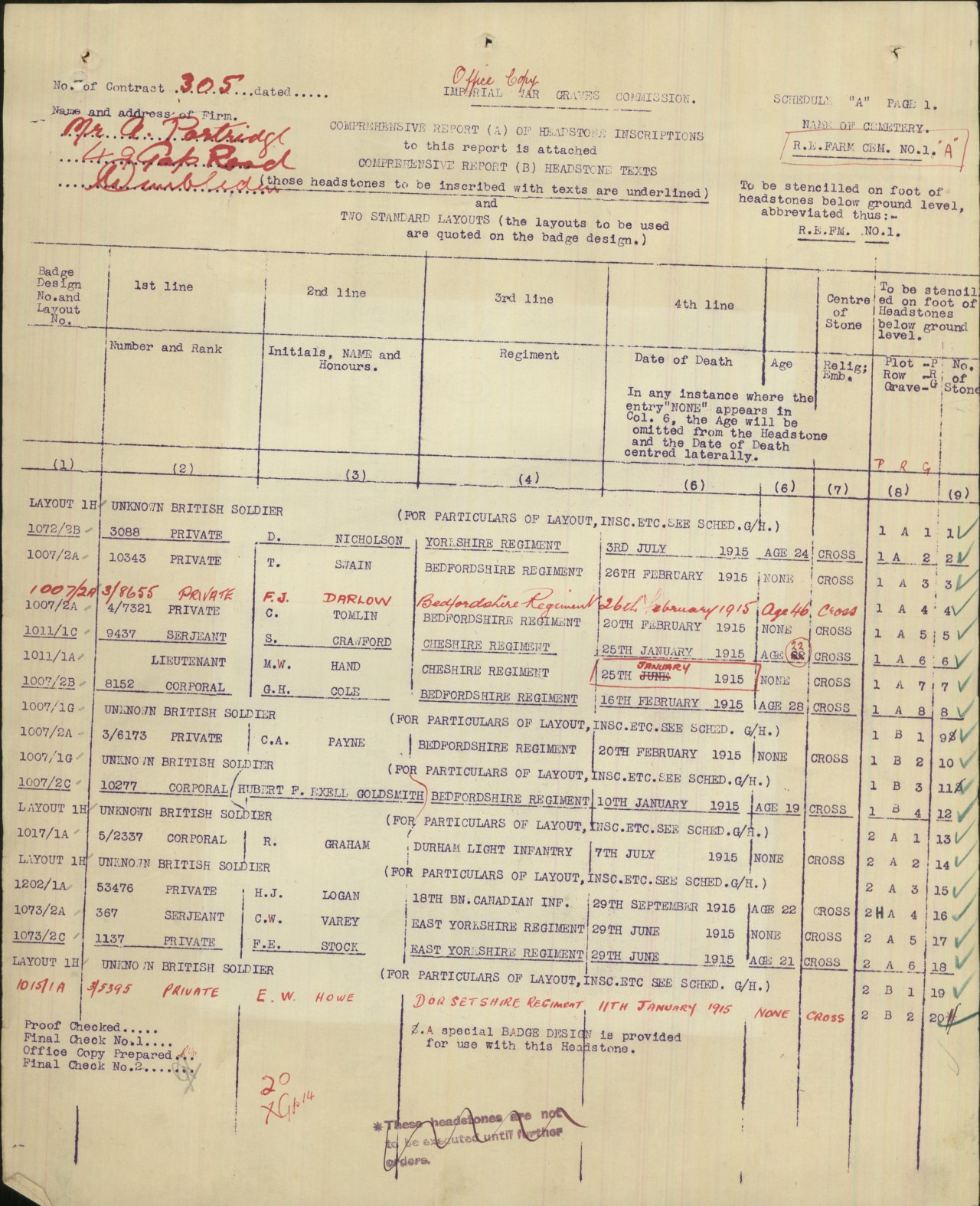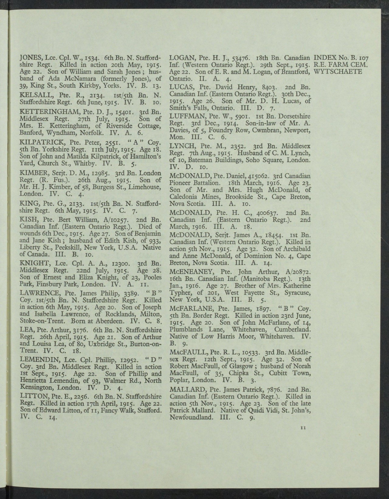 First 18th Battalion soldier to be killed in action. Medical Officer’s war diary recounts an event occurred at 5:30 PM on 28 September 1915. Circumstances of Death Card reads: “Died of Wounds.” In the Field, Belgium. While on duty at a listening post thirty yards in front of our lines, at about 9.30 P.M. September 29th, 1915, he was wounded in the stomach by enemy rifle bullet and died shortly afterwards.