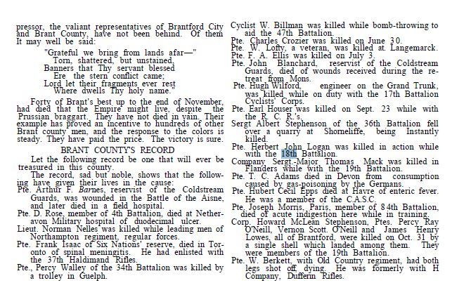 The official casualty lists, published this morning in Ottawa contain the name of Private Herbert John Logan, only son of Mrs. Logan, Darling Street, he being reported killed in action. Private Logan who was working in Pittsburgh at the time of the outbreak of the war, returned shortly after to visit his mother in Brantford, and decided to enlist in the 18th Battalion at London. Private Logan was 22 years of age.