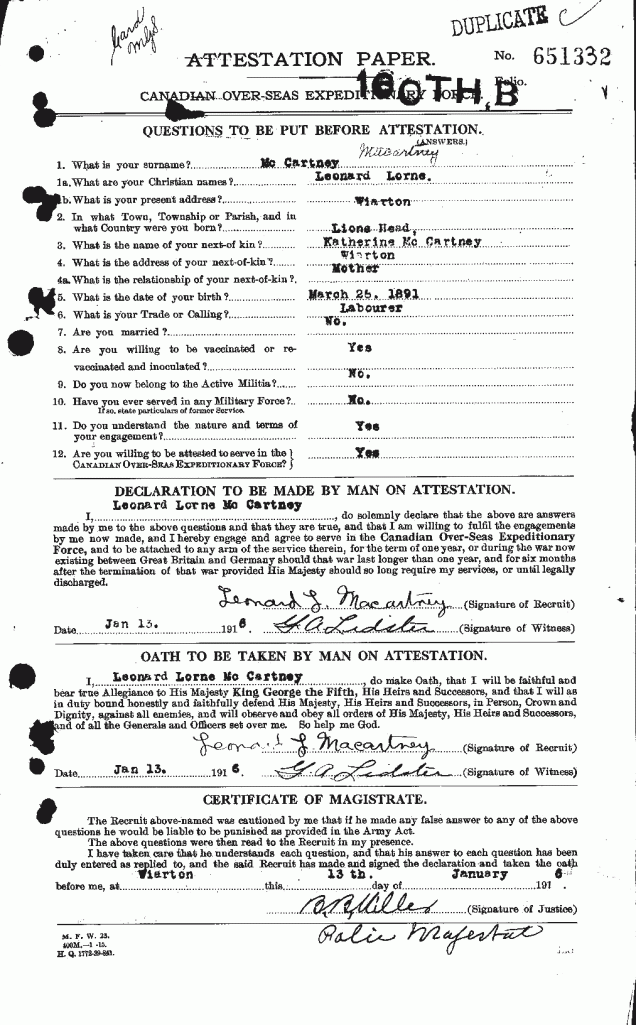 Macartney, Leonard Lorne: Service no. 651332 CVWM Page Digitized Service Record CWGC Page Source: August 1918 casualty. Find-A-Grave Macartney, Leonard Lorne: Service no. 651332. Source: CVWM. Share this: Click to email a link to a friend (Opens in new window) Email Click to share on Facebook (Opens in new window) Facebook Click to share on X (Opens in new window) X Click to share on Reddit (Opens in new window) Reddit Click to share on LinkedIn (Opens in new window) LinkedIn Click to print (Opens in new window) Print Click to share on Tumblr (Opens in new window) Tumblr Click to share on Pocket (Opens in new window) Pocket Click to share on Pinterest (Opens in new window) Pinterest Click to share on Telegram (Opens in new window) Telegram Click to share on WhatsApp (Opens in new window) WhatsApp Like Loading...
