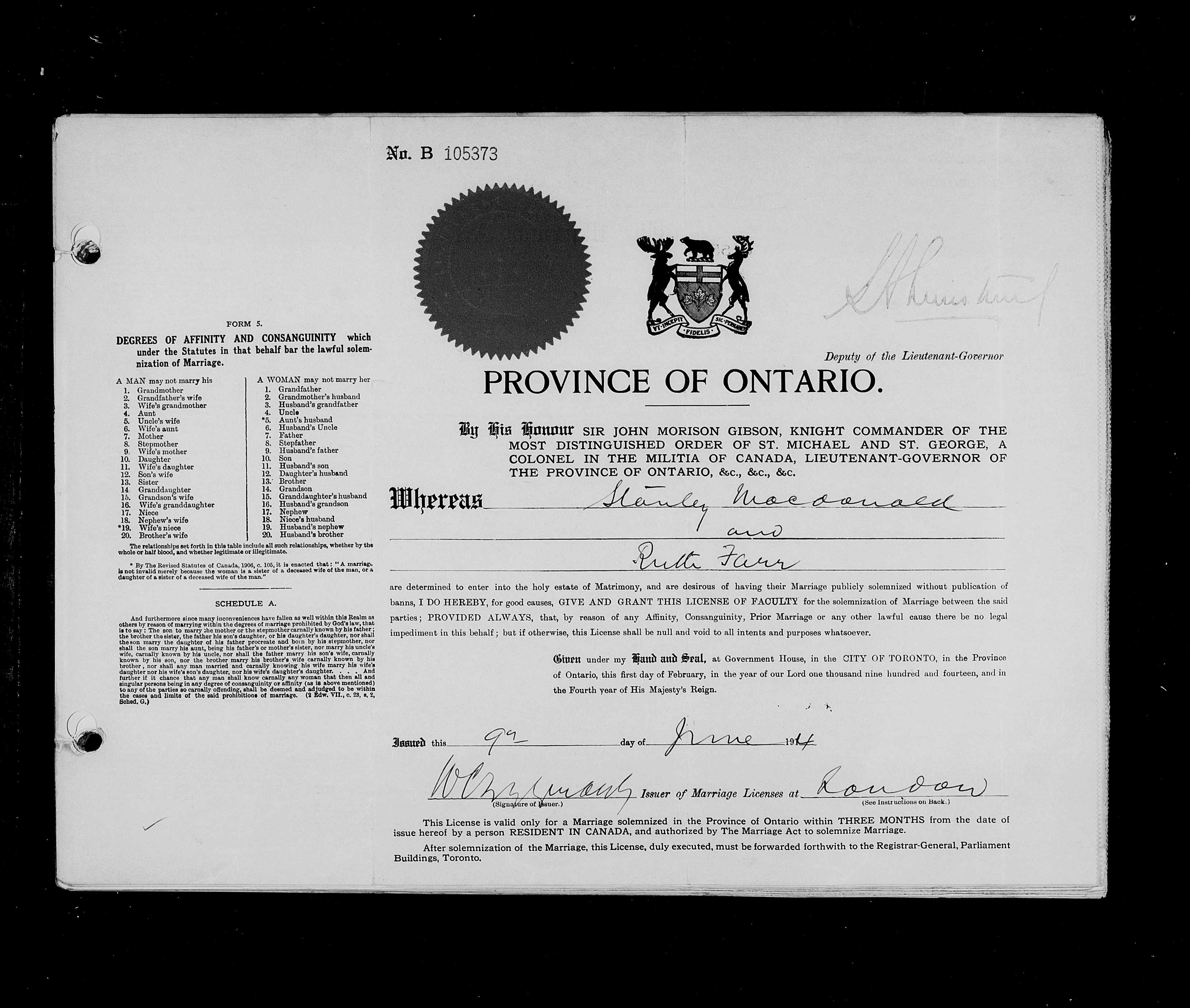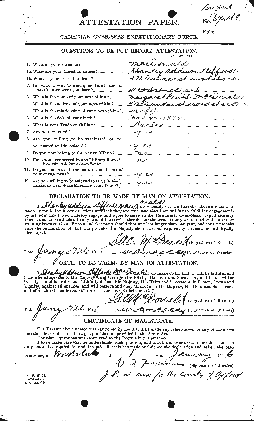 Family Search: When Private Stanley Addison Clifford MacDonald was born on 22 November 1892, in Blenheim Township, Oxford, Ontario, Canada, his father, Andrew Nelles McDonald, was 21 and his mother, Alberta Jane Blake, was 18. He married Ruth Marguerite Farr on 9 June 1914, in London, Canada West, British North America. They were the parents of at least 1 daughter. He immigrated to Detroit, Wayne, Michigan, United States in 1911 and lived in Detroit, Wayne, Michigan, United States in 1910 and Woodstock, Oxford, Ontario, Canada in 1916. He registered for military service in 1916. In 1916, at the age of 24, his occupation is listed as barber in Woodstock, Oxford, Ontario, Canada. He died on 24 August 1918, in Frensham, Surrey, England, United Kingdom, at the age of 25, and was buried in Waverley, Surrey, England, United Kingdom.