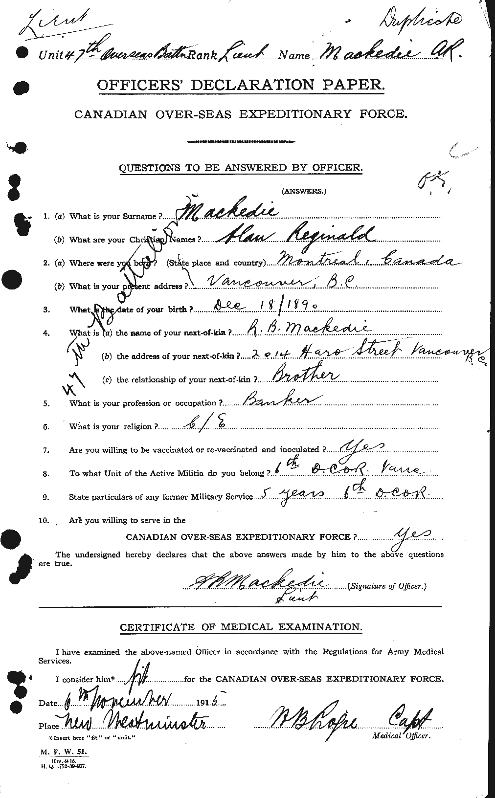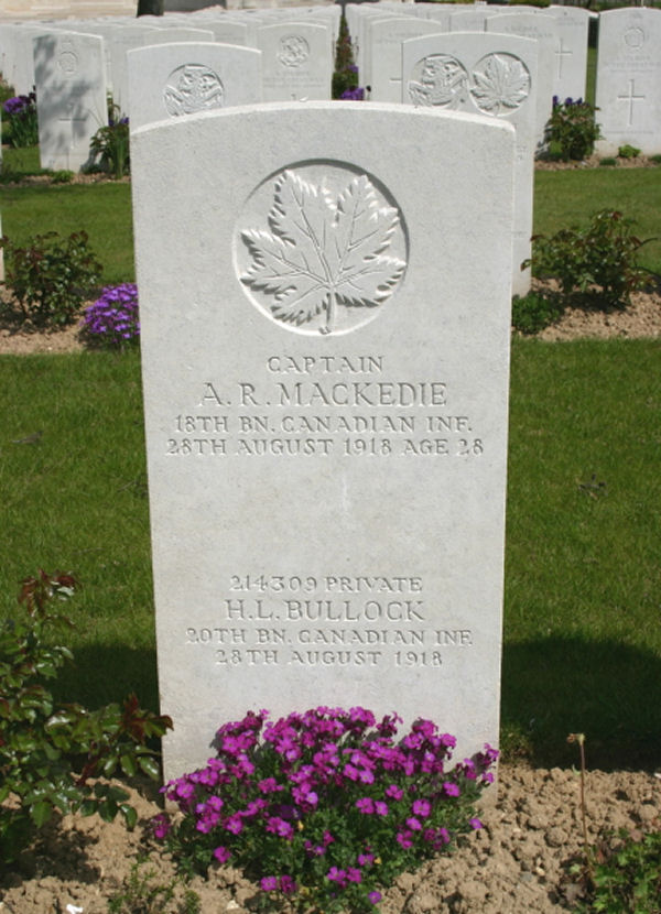 1144. MacKedie, A.R. (Alan Reginald) [1890-1918] See Letters from the front: Being a Record of the Part Played by Officers of the Bank in the Great War, 1914-1919. Toronto: Canadian Bank of Commerce. 19201921, vol 1, 344p.: ill., map (fold), ports., index; 25 cm., 82. AMICUS 2417893. NSHD. IA. Reproduced [Manotick, ON]: Archive CD Books Canada CA0291. ISBN 9781897405246. AMICAUS 37410824. OONL. Extract for letter, January 15, 1916, describing recent experiences. Born in Montreal, MacKedie moved with his parents to Vancouver before 1911. He was a clerk in the Canadian Bank of Commerce there with militia experience when he joined the 47th (New Westminster) Battalion as a lieutenant in November 1915. He transferred into the 18th (Western Ontario) Battalion as a captain in April 1916 and was killed near Cambrai on August 28, 1918.