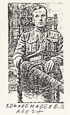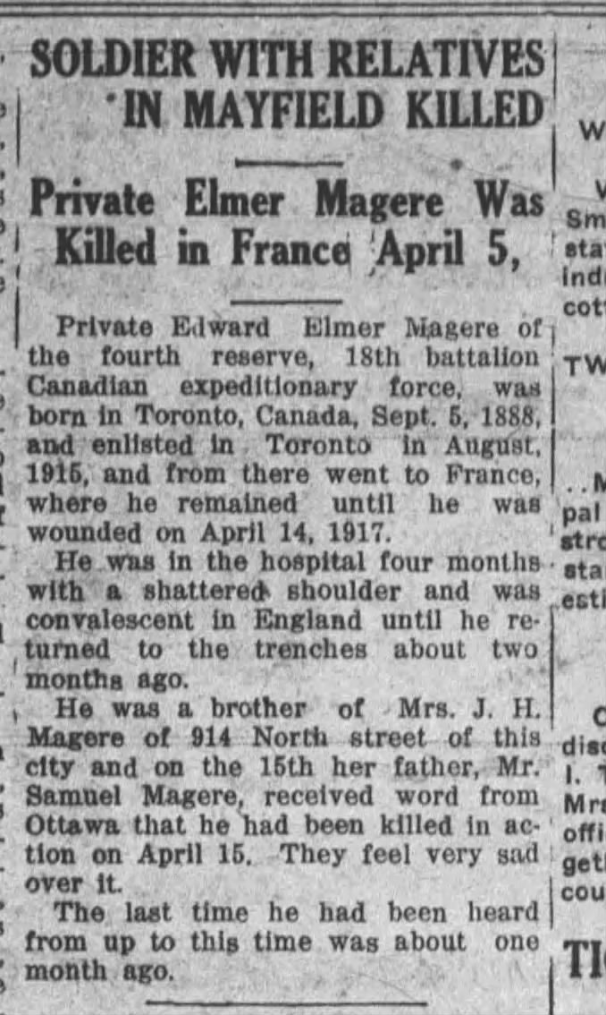 Word has been received from the War Office at Ottawa by Mrs. Little, 296 Wallace avenue, and by his father Mr. S. Mager [sic], now in Kentucky, that Pte. Ed.. Mager [sic] was killed in action on April 5th. He went overseas with the 124th “Pals” Battalion in August 1916, and was in England three months before crossing to France. He was severely wounded at Vimy Ridge on April 9th, with gunshot wounds to the shoulder and the left thigh. Pte. Mager [sic] was 29 years old, and previous to enlisting was employed as a filer to the Consumers’ Box Company.